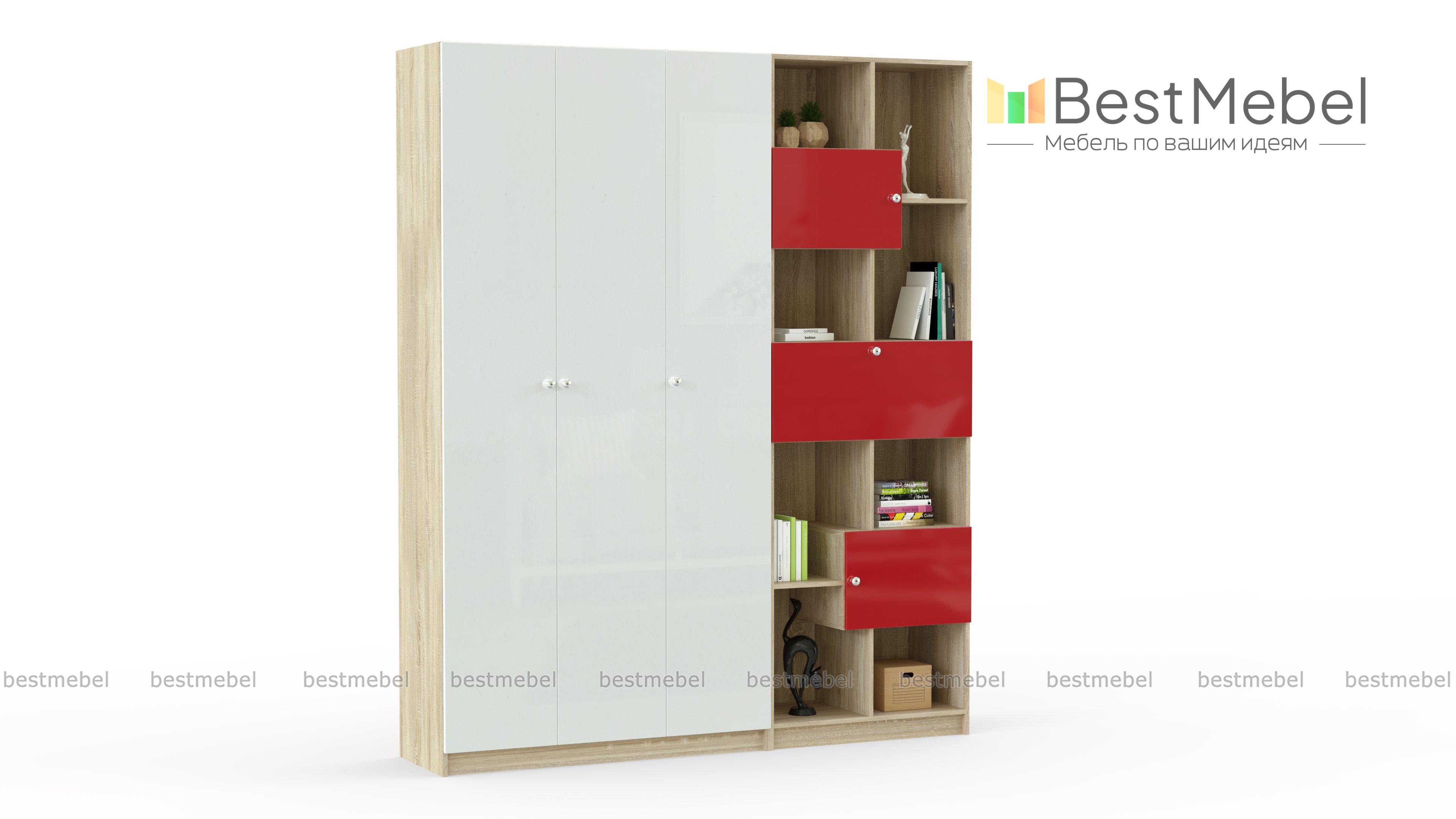 Шкаф-стеллаж Шелби-8 BMS – это трехдверный распашной шкаф с полками и оригинальный стеллаж с асимметрично расположенными открытыми и глухими секциями. Комбинированная модель поможет разместить домашний текстиль, бытовые мелочи, книги и предметы декора, а также легко найти нужную вещь. Эффектным решением для современных интерьеров станет сочетание древесных тонов и яркого контрастного глянца. Купить шкаф-стеллаж Шелби-8 BMS и оптимизировать хранение вам поможет наш интернет-магазин.