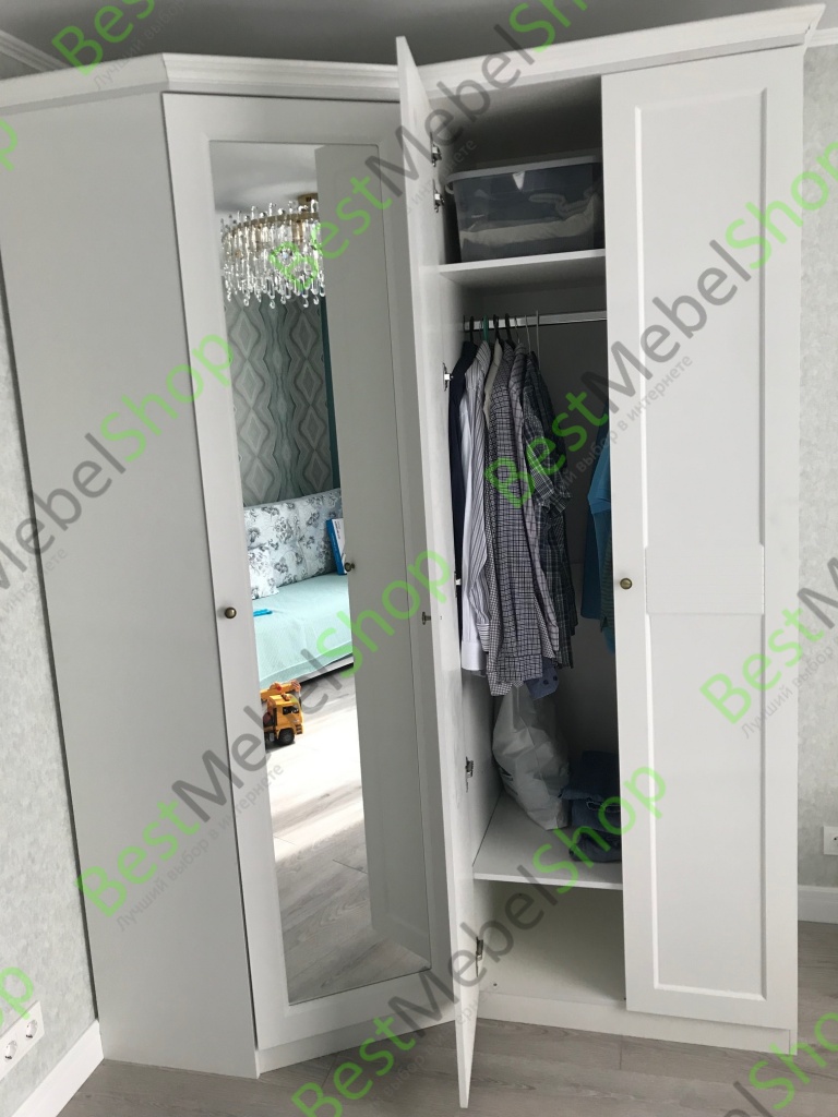 Хороший получился шкаф, удобный. Идеально вписался в угол комнаты, сделали под наши размеры, все пожелания учли, дизайн согласовали перед запуском в производство. Сделали быстро, чуть больше недели с согласованиями и т.п. Мы видимые стены заказали тоже из МДФ, чтобы не отличалось от дверей\фасада (остальной корпус из ЛДСП), это оказалось верным решением т.к. цвета всё таки различаются (это стоило примерно +10%). Ну и скрытый монтаж видимых поверхностей, чтобы не было видно крепежа. Собирал сам, ничего сложного, только угловой шкаф тяжёлый, когда его нужно было переворачивать и ставить, но одному мужику по силам. Шкаф вышел в итоге на 30-25% дешевле чем в любом магазине\салоне где нам считали шкафы. Так что советую.