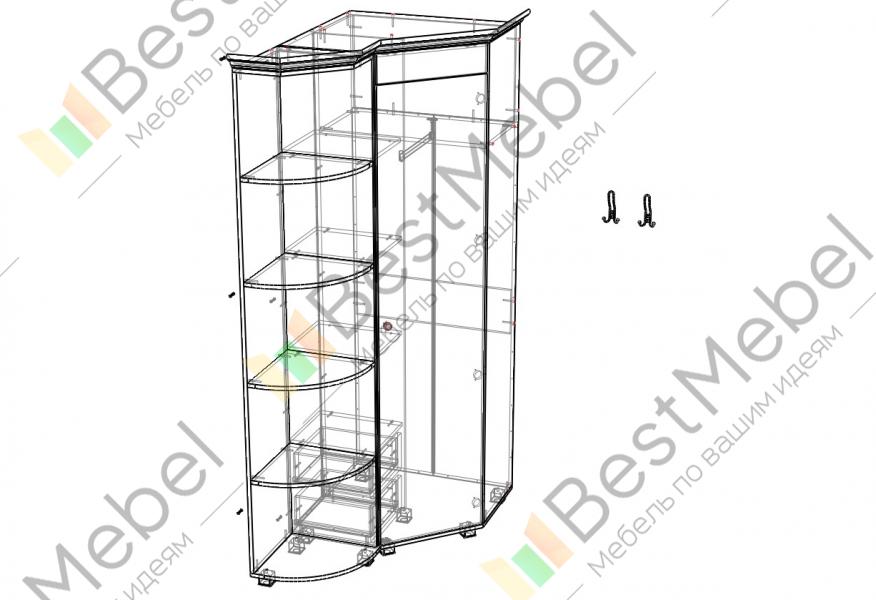 Шкаф угловой ЭМ-1 превосходно подходит для тех, кто предпочитает классический стиль современному. Все элементы мебели выполнены в едином цвете. Шкаф прекрасно впишется в интерьер Вашей спальни либо гостиной. Резные дверки с аркой и узором в виде пилястр добавляют изделию неповторимость. Преимуществом является наличие открытых регулируемых ножек. Модель легко заменит гардеробную и свободно вместит все необходимые вещи. Для этого внутри оборудована штанга для различной одежды и широкая ниша для невысокой обуви.