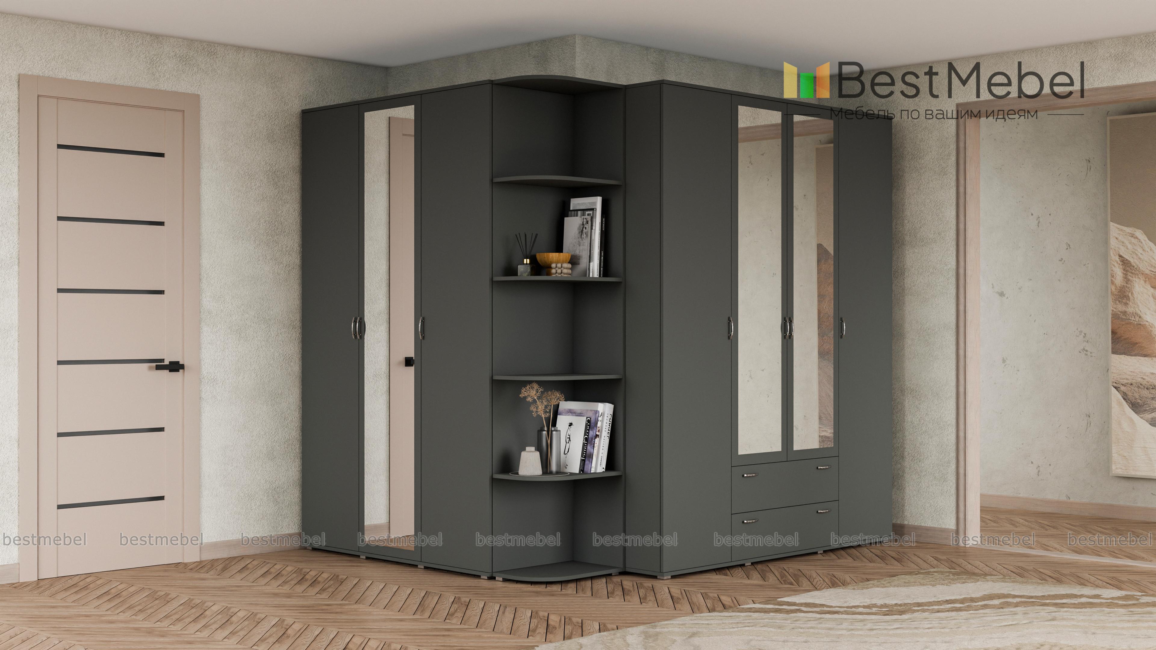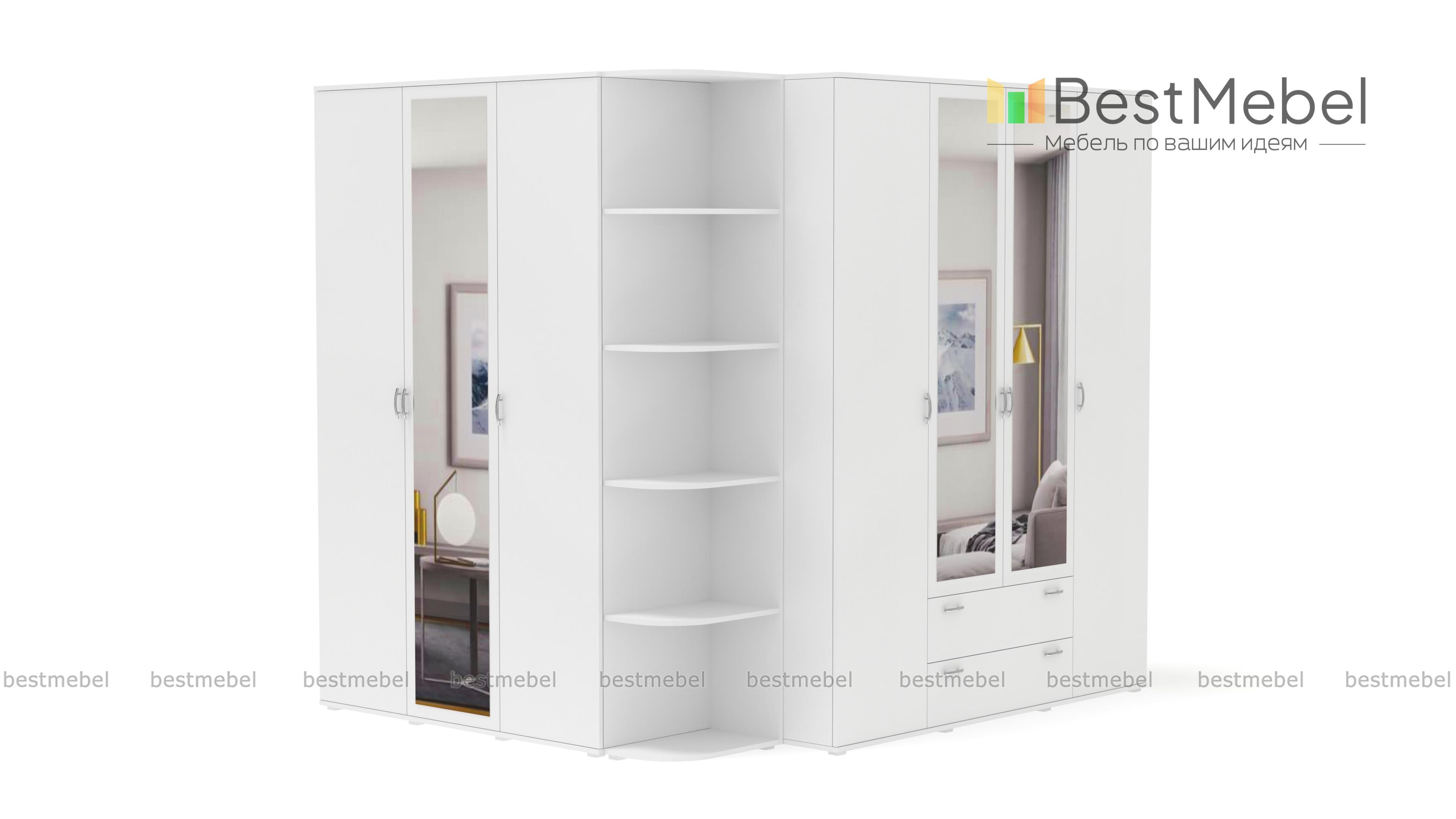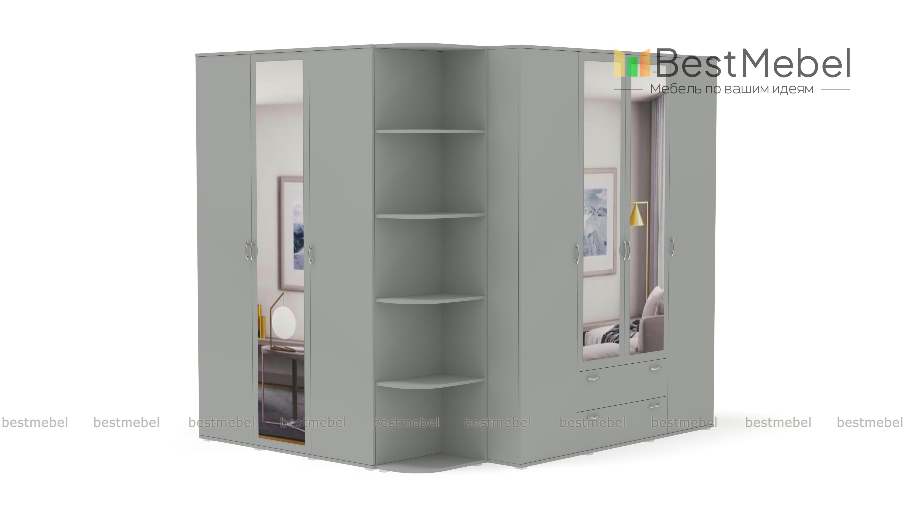 Шкафы Лотос отличаются вместительностью и практичностью. Угловая комплектация прекрасно впишется в интерьер с соответствующей геометрией. Состоит из трех секций. Модуль с тремя дверьми, центральная с зеркалом. Угловой стеллаж. Шкаф с четырьмя дверьми, две из которых зеркальные, и ящиками. Комплектуется штангами, выдвижными ящиками, полками. Внутреннее пространство подходит для хранения различных видов одежды, а также обуви. На стеллаже удобно расположить книги, цветы, предметы интерьера в качестве декора.