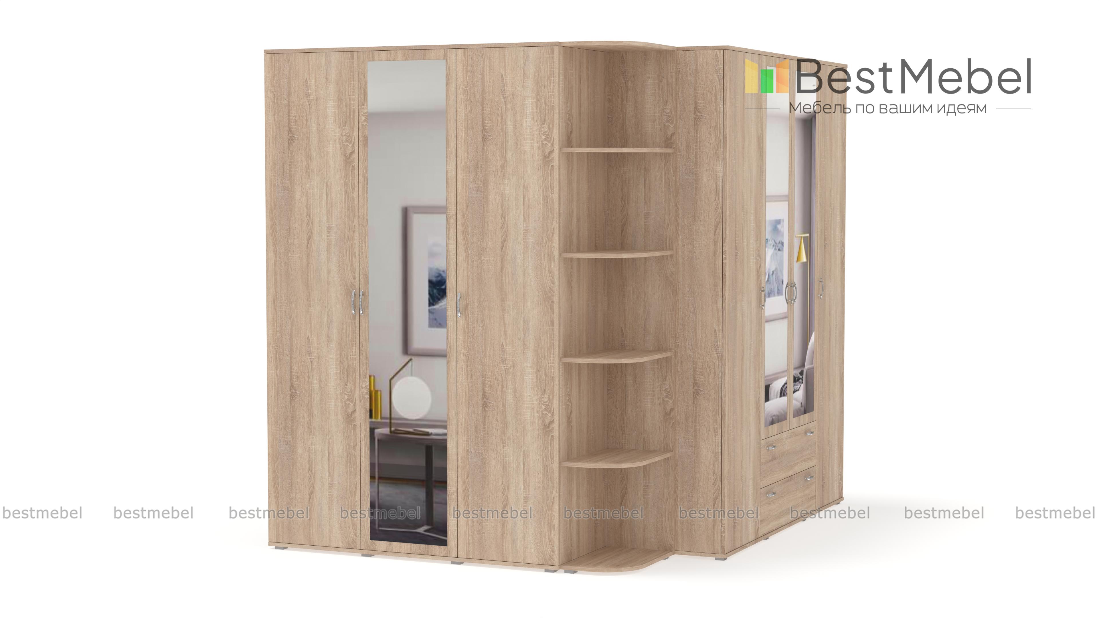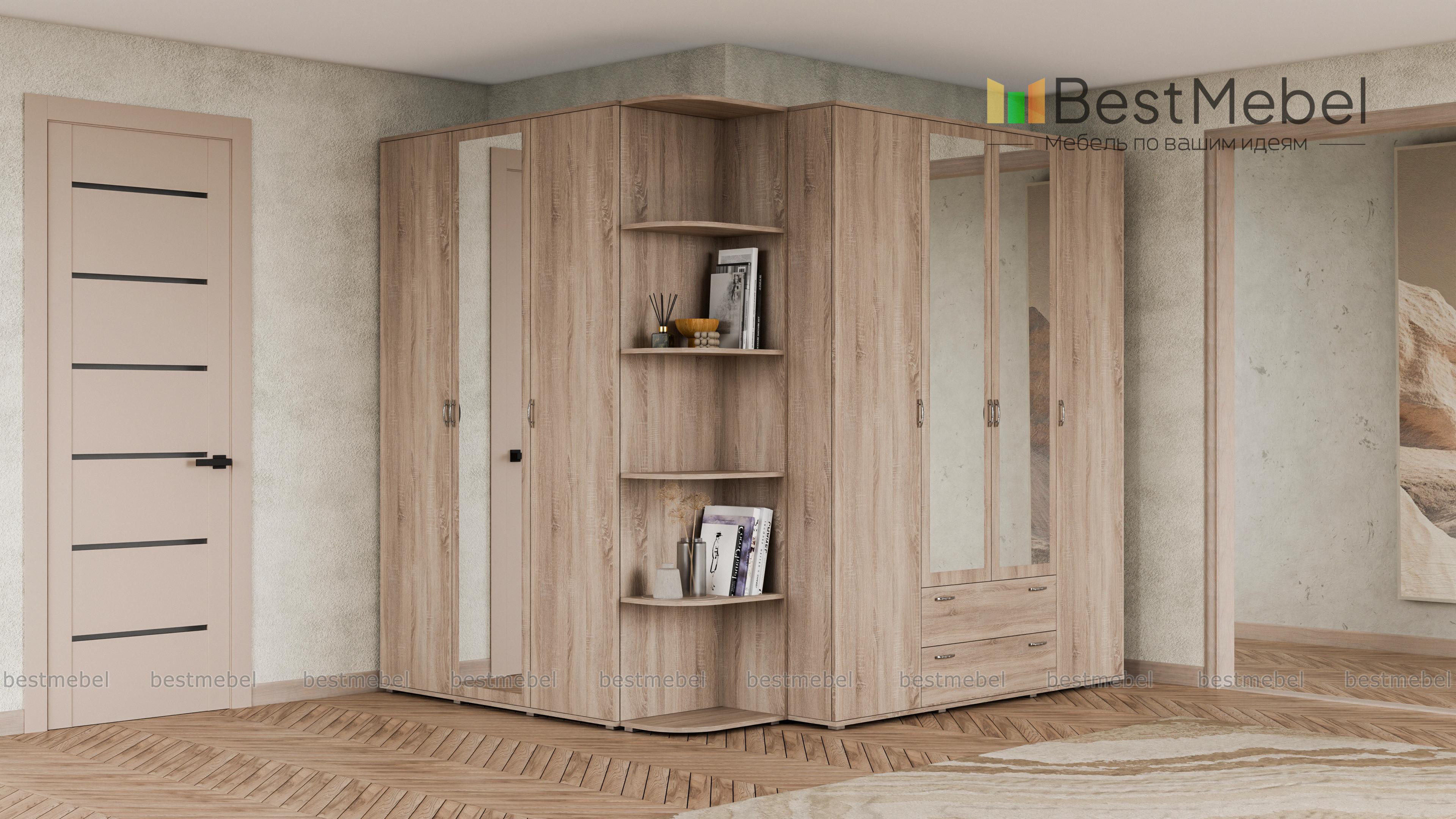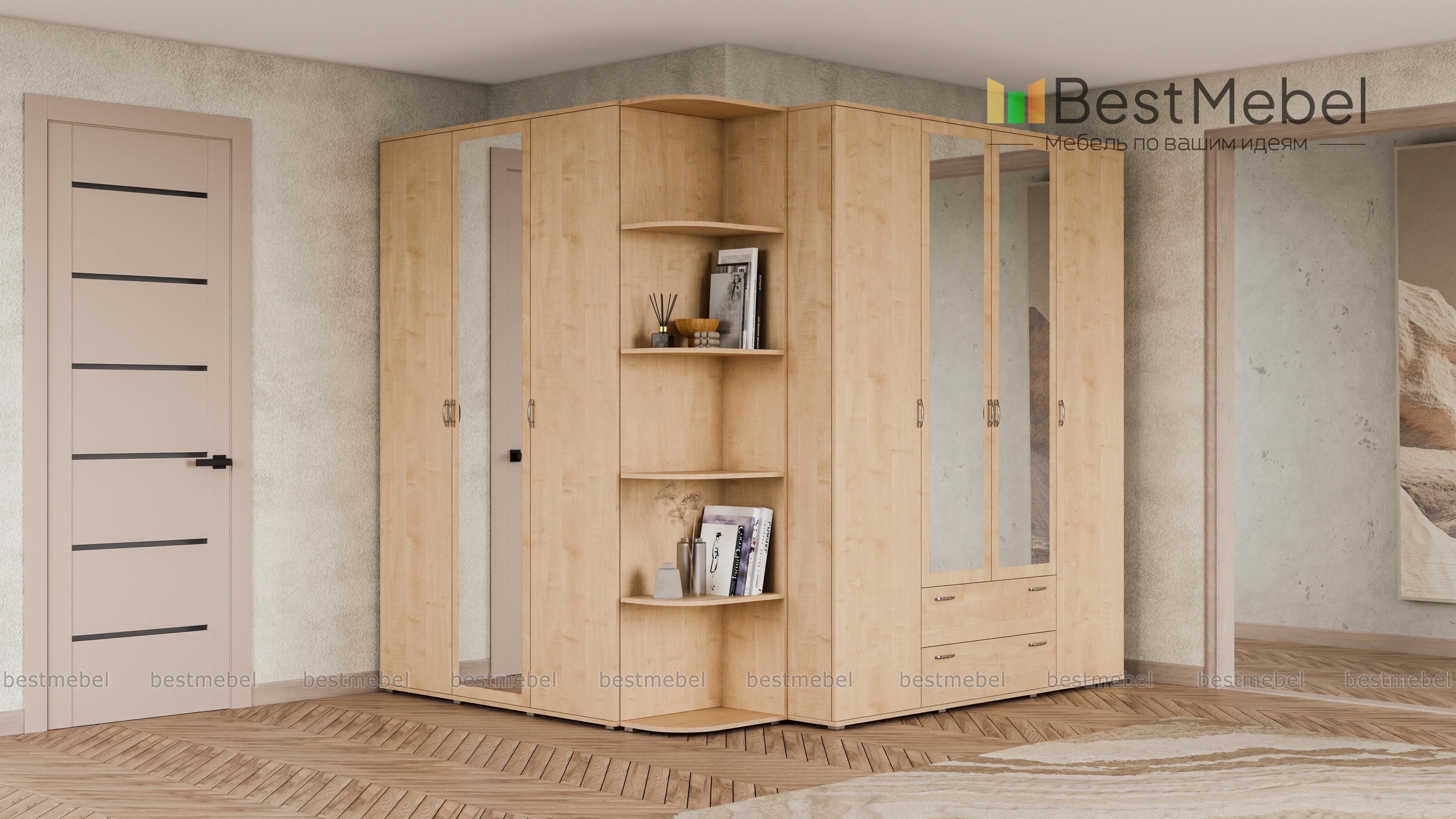 Шкафы Лотос отличаются вместительностью и практичностью. Угловая комплектация прекрасно впишется в интерьер с соответствующей геометрией. Состоит из трех секций. Модуль с тремя дверьми, центральная с зеркалом. Угловой стеллаж. Шкаф с четырьмя дверьми, две из которых зеркальные, и ящиками. Комплектуется штангами, выдвижными ящиками, полками. Внутреннее пространство подходит для хранения различных видов одежды, а также обуви. На стеллаже удобно расположить книги, цветы, предметы интерьера в качестве декора.