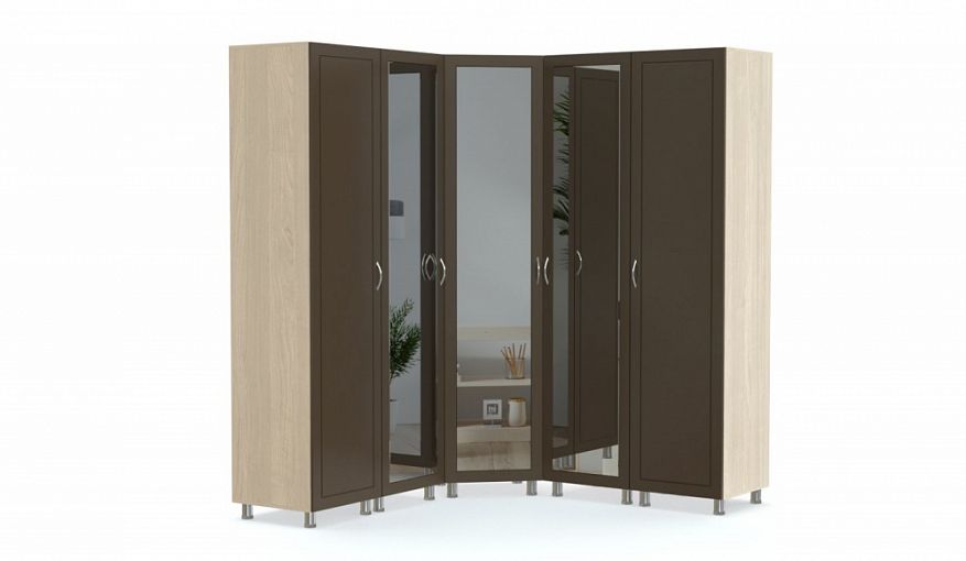 Угловой шкаф Мелина 6 BMS вместителен, но при этом компактен, а высокие металлические ножки придают конструкции устойчивость и визуальную легкость. Шкафная группа, выполненная в контрастных древесных тонах, включает в себя угловой однодверный модуль и пеналы с глухими и зеркальными фасадами. Просторные отделения с полками и штангами обеспечат удобное хранение предметам гардероба и домашнему текстилю. Купить угловой шкаф Мелина 6 BMS вы сможете в нашем интернет-магазине, по желанию изменив цвет и размеры.