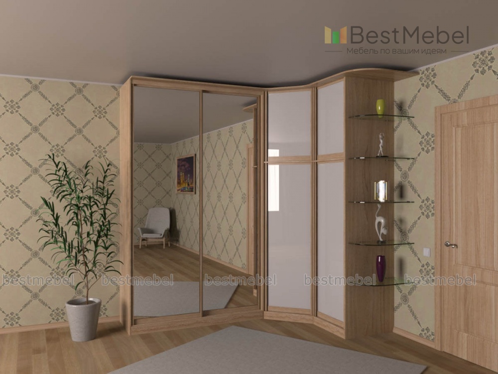 Угловой шкаф 62 BMS станет универсальным решением для спален и прихожих в современном стиле. Встроенная конструкция выгодно использует особенности планировки и включает в себя двухдверное раздвижное отделение, две однодверные секции с антресолями и изящные, безопасно скругленные стеклополки для мелочей. Корпус нейтральных древесных тонов сочетается с фасадами в белом цвете и ростовыми зеркалами, удобными для примерок и зрительно расширяющими границы комнаты. Купить Угловой шкаф 62 BMS и компактно разместить гардероб и домашний текстиль вам поможет наш интернет-магазин.