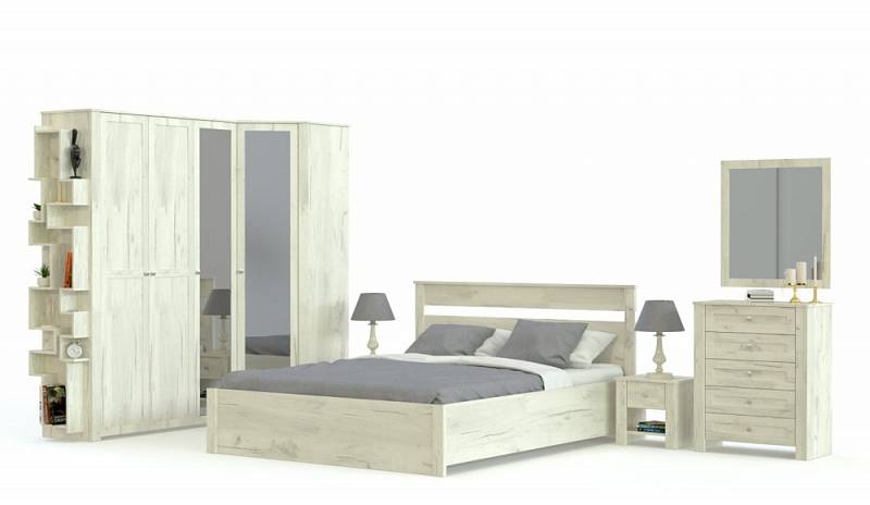 Романтичная спальня в стиле прованс привнесет в вашу комнату атмосферу легкости и сделает ее просторнее и светлее. Комплект из нескольких шкафов угловой конструкции сэкономит пространство и позволит разместить множество вещей, отдых будет комфортным благодаря двуспальной кровати с тумбами, а для ухода за собой эта модель дополнена очаровательным туалетным столиком с навесным зеркалом. Модель Бриз комплектация 1 BMS выполняется в светлых тонах и декорирована изящными металлическими ручками.