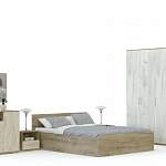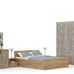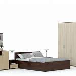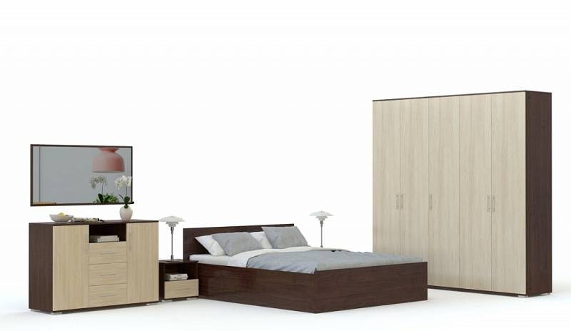 Современный гарнитур в спокойных традиционных тонах сделает просторную спальню комфортной и уютной. Бережное хранение вашему гардеробу обеспечит композиция из двух вместительных шкафов, оснащенных полками и штангами для одежды, а также комод с разнообразными отделениями. Отдых будет полноценным с просторной кроватью, оборудованной двумя боковыми тумбами для важных мелочей. Выполняется спальня INES BMS в контрастных цветах и декорирована по фасадам оригинальными ручками.