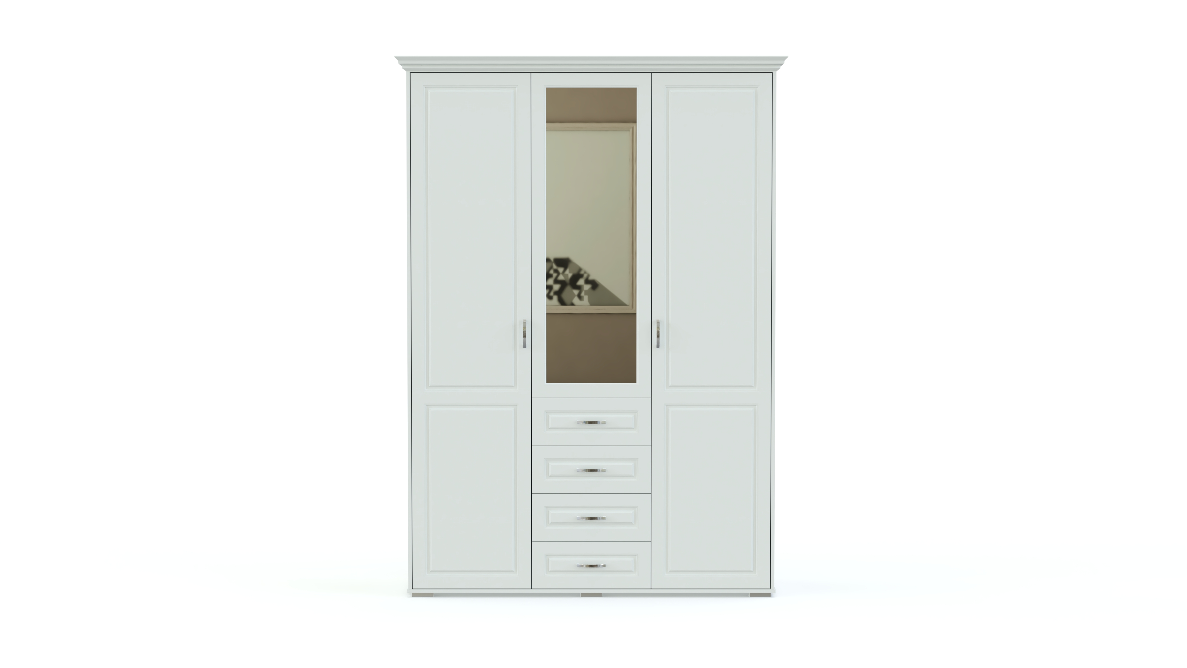 Спальня Мирма 4 BMS станет выбором тех, кто ценит сдержанную элегантность классики. Эффектный гарнитур состоит из кровати, высокая спинка в изголовье которой декорирована экокожей с каретной стяжкой, прикроватных тумб, бельевого комода с зеркалом, а также трехдверного распашного шкафа с выдвижными ящиками для мелочей. Фрезерованные фасады предметов выполняются в благородных древесных тонах. Купить спальню Мирма 4 BMS по лучшей цене вы сможете в нашем интернет-магазине.