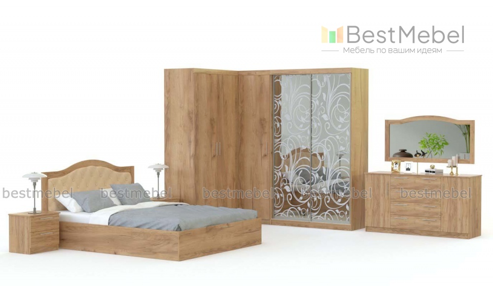 Спальня Техно 4 BMS будет гармонично смотреться в просторных помещениях. Среди модулей композиции кровать с фигурно вырезанной спинкой, декорированной мягкой вставкой в экокоже, прикроватные тумбы, комбинированный комод с навесным зеркалом, журнальный столик со стеклянной столешницей и угловой платяной шкаф с раздвижными и распашными отделениями. Натуральные оттенки под древесный массив помогут создать комфортную, спокойную атмосферу. Купить спальню Техно 4 BMS приглашаем в наш интернет-магазин.