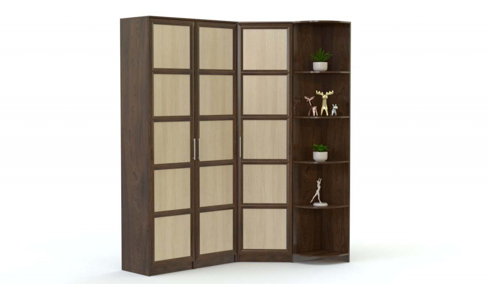 Спальня Токио 7 BMS по-восточному лаконична и выигрышно смотрится на контрасте древесных оттенков. В пространство у изголовья кровати гармонично вписываются две тумбы, для хранения постельного белья, одежды и всевозможных аксессуаров предусмотрены угловой шкаф с торцевым стеллажом и дополненный навесным зеркалом комод. Для отделки фасадов использованы широкие накладки и декоративная решетка. Купить спальню Токио 7 BMS с учетом необходимых размеров вы сможете в нашем интернет-магазине.