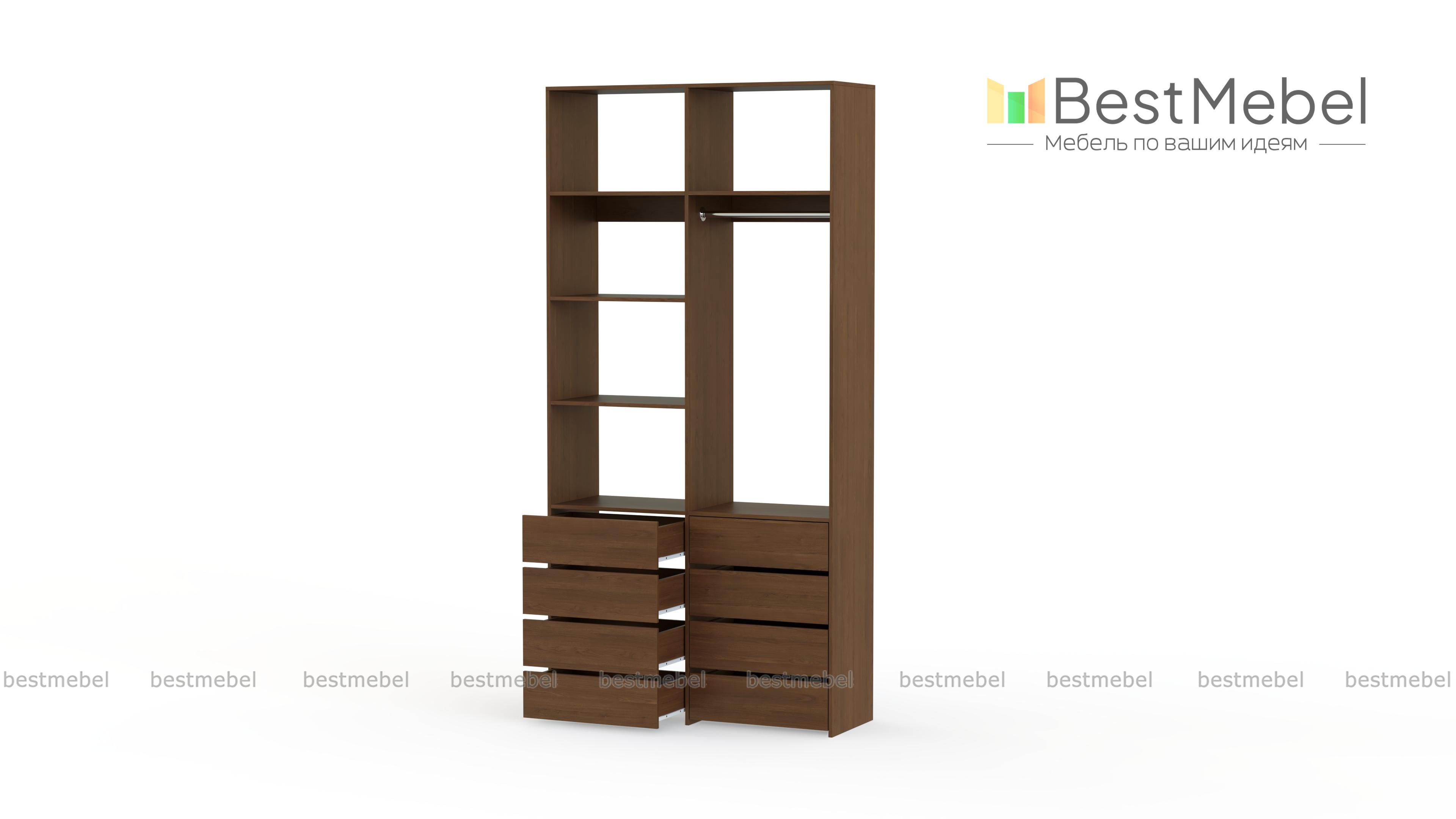 Стеллаж для одежды Мирта 3 BMS – функциональный и стильный предмет обстановки для вашего дома. Открытая конструкция позволяет разместить на виду повседневную одежду, коробки с обувью и органайзеры с мелочами, а для прочих вещей предусмотрены два ряда выдвижных ящиков. Прочность и долговечность стеллажу гарантируют материалы и фурнитура высокого качества. Купить стеллаж для одежды Мирта 3 BMS вы сможете в нашем интернет-магазине с изготовлением по индивидуальным размерам.
