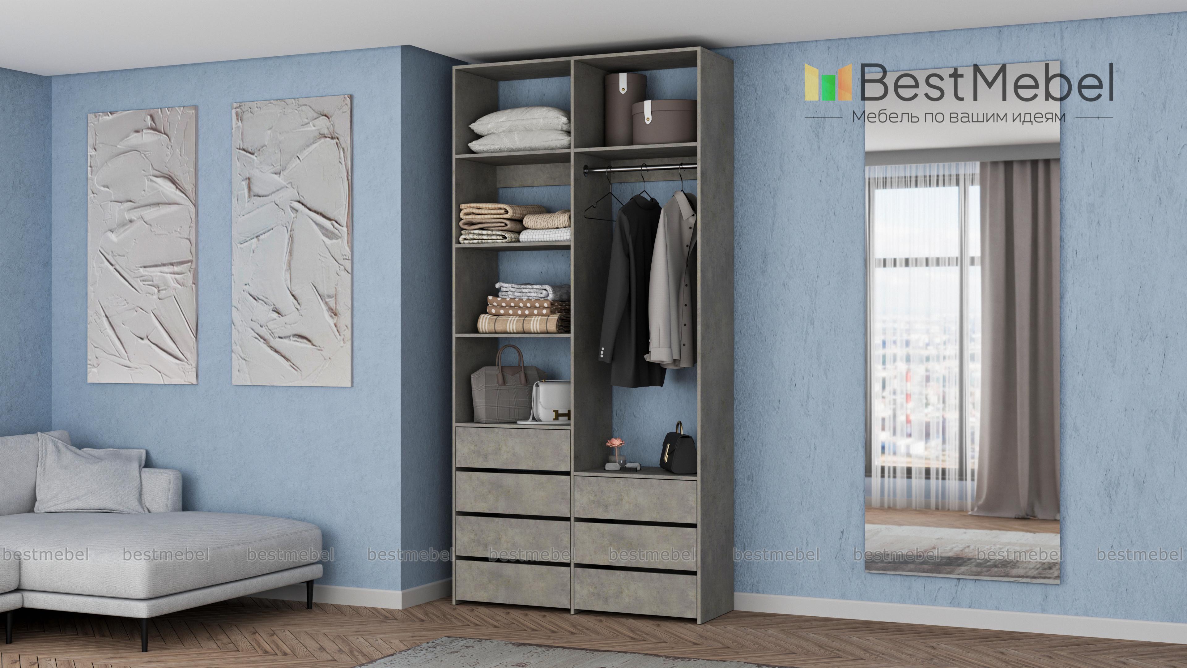Стеллаж для одежды Мирта 41 BMS позволит вам зонировать пространство для хранения. Компактная двухсекционная конструкция разделена на отсек для вешалок, бельевые полки и два ряда выдвижных ящиков — под аксессуары, трикотаж и другие мелкие вещи. Для простого функционального дизайна стеллажа оптимально подходит светлый базовый оттенок. Купить стеллаж для одежды Мирта 41 BMS вы всегда сможете на сайте нашего интернет-магазина, по желанию изменив цвет и размеры.