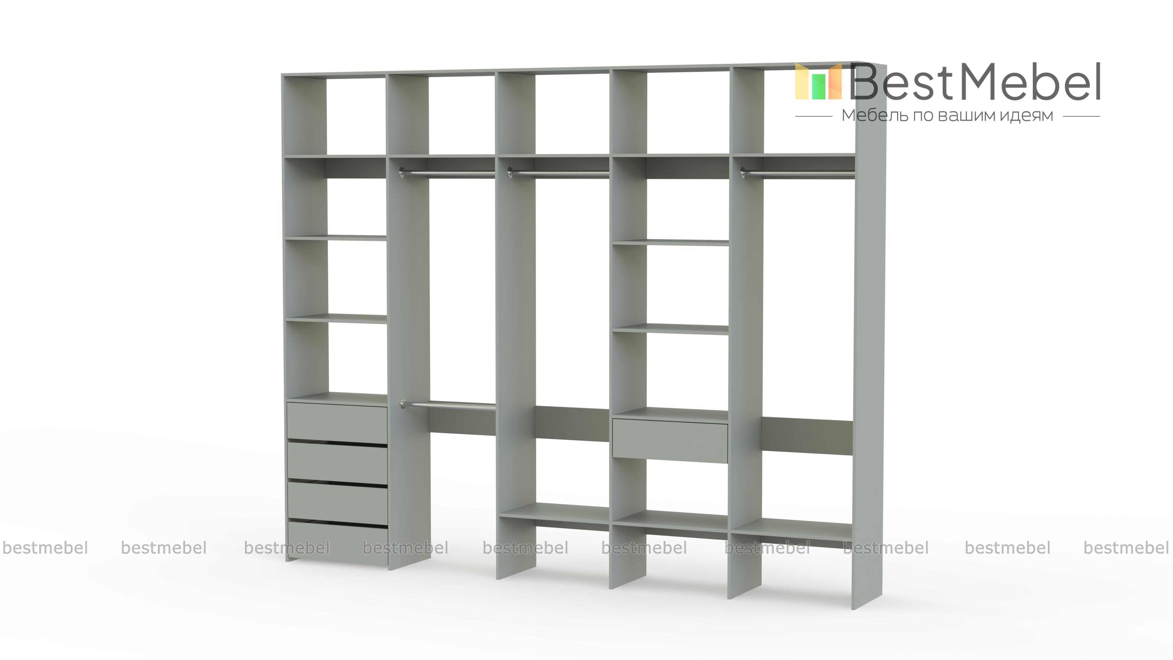 Стеллаж для одежды Мирта 73 BMS удобно зонирует пространство для хранения. Четыре штанги и полки позволят рассортировать одежду по категориям, расположенные на нижнем уровне полки удобны для создания обувниц, а в ящики можно убрать аксессуары, белье и другие мелочи. Дизайн стеллажа лаконичен и универсален, а поверхности из ламинированной ДСП устойчивы к влаге и появлению царапин. Купить стеллаж для одежды Мирта 73 BMS, изготовленный по вашим размерам, вы сможете в нашем интернет-магазине.