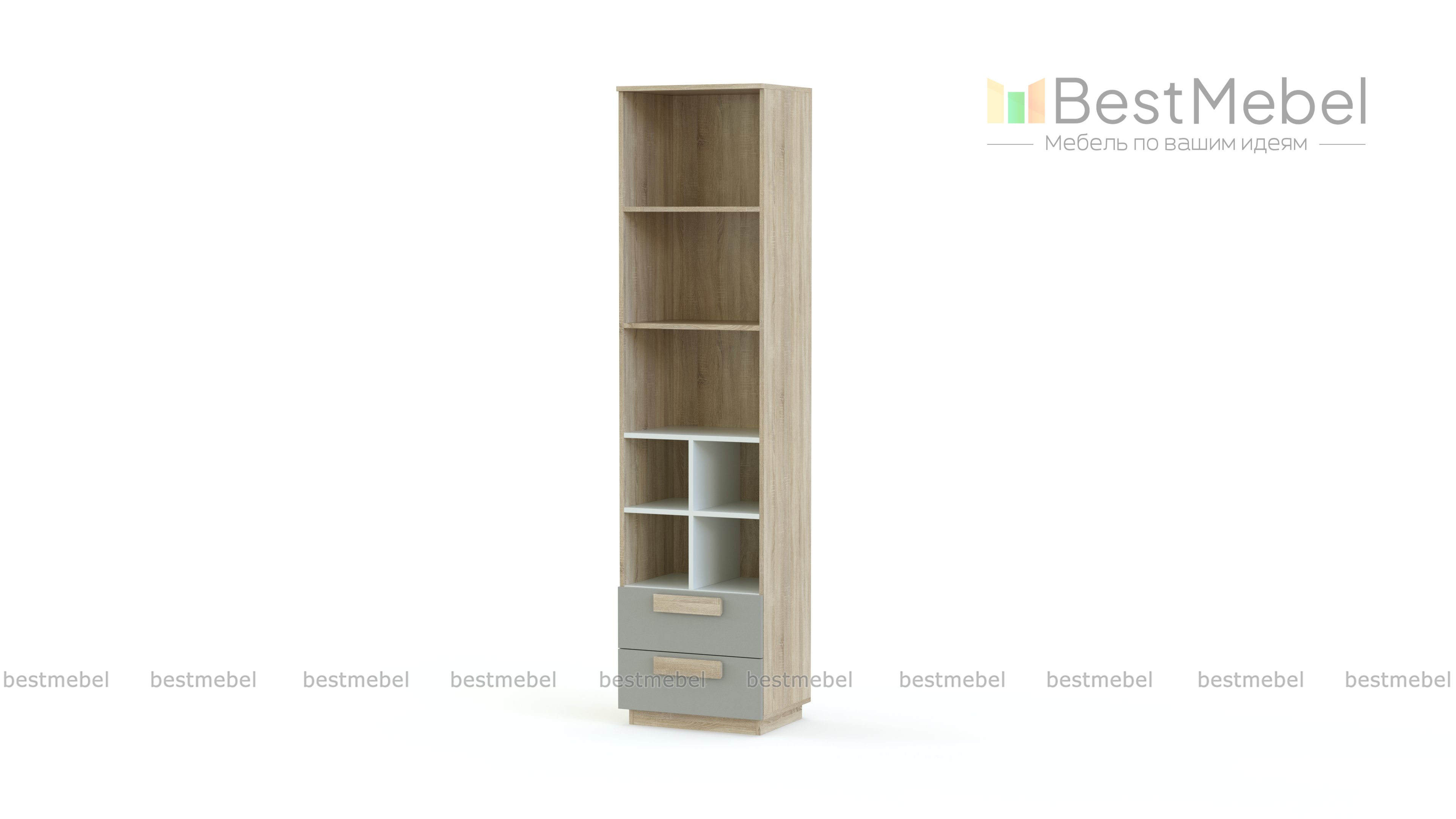 Стеллаж Пирит 2 BMS дополнит рабочую зону удобной системой хранения для учебных материалов, канцелярских мелочей и декоративных предметов. Современная молодежная модель отличается компактными размерами и комбинированной конструкцией – открытые книжные секции дополнены двумя выдвижными ящиками в основании. Светлые древесные тона корпуса эффектно сочетаются с выделенными белым нишами и фасадами в сером оттенке. Купить стеллаж Пирит 2 BMS вы сможете в нашем интернет-магазине.