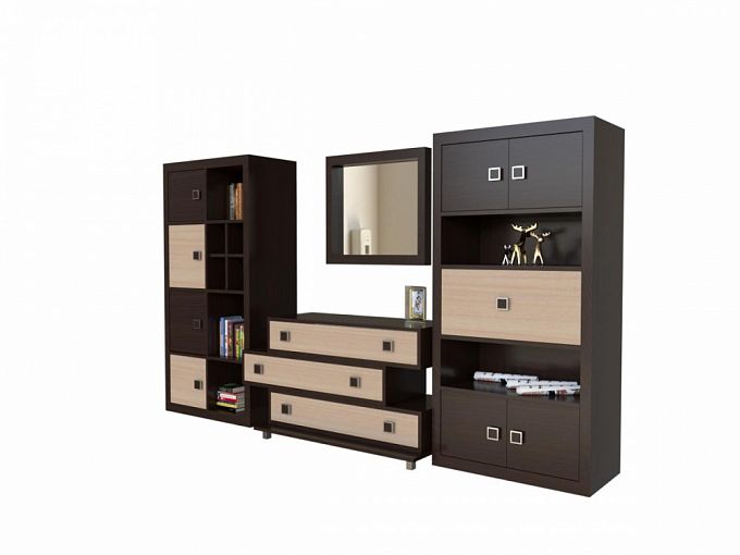 Гостиная Богема 2 BMS – практичное решение для меблировки современной гостиной. Благодаря конструкции из отдельных элементов, легко комбинирующихся друг с другом, вы сможете создавать разнообразные композиции по своему вкусу и подчеркнуть достоинства планировки. В комплект входят два шкафа с распашными отделениями и нишами, асимметричная тумба с выдвижными ящиками и навесное панно с зеркалом. Купить гостиную Богема 2 BMS, выполненную в контрастных оттенках венге, приглашаем в наш интернет-магазин.