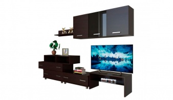 Модульная система Богема 6 BMS включает в себя все необходимое комфортной современной гостиной. Компактные размеры модулей и лаконичный дизайн позволят создавать любые композиции на ваш вкус. В комплект входят подставка под ТВ и аппаратуру, тумбы, открытые полки, одна из которых стеклянная и три навесных шкафчика квадратной формы. Фасады оттенка венге декорированы хромированной фурнитурой. Купить модульную систему Богема 6 BMS, подобрав цветовое решение, приглашаем в наш интернет-магазин.