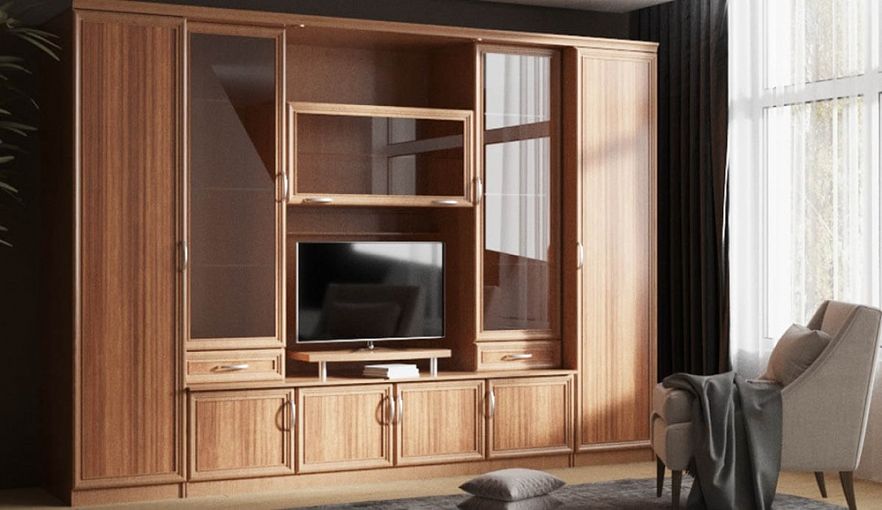 Стенка Аккорд-2 Нью BMS гармонично впишется в просторные гостиные и придется по душе тем, кто ценит классические интерьеры. Элегантная модель в глубоких древесных тонах с рамочными фасадами отличается строгой геометричной формой и разнообразием отделений. В единую композицию объединены шкафы для одежды, витрины, распашные отделения, выдвижные ящики и ниша под ТВ с подставкой. Купить стенку Аккорд-2 Нью BMS вы сможете по доступной цене в нашем интернет-магазине, подобрав цветовое решение из богатой палитры.