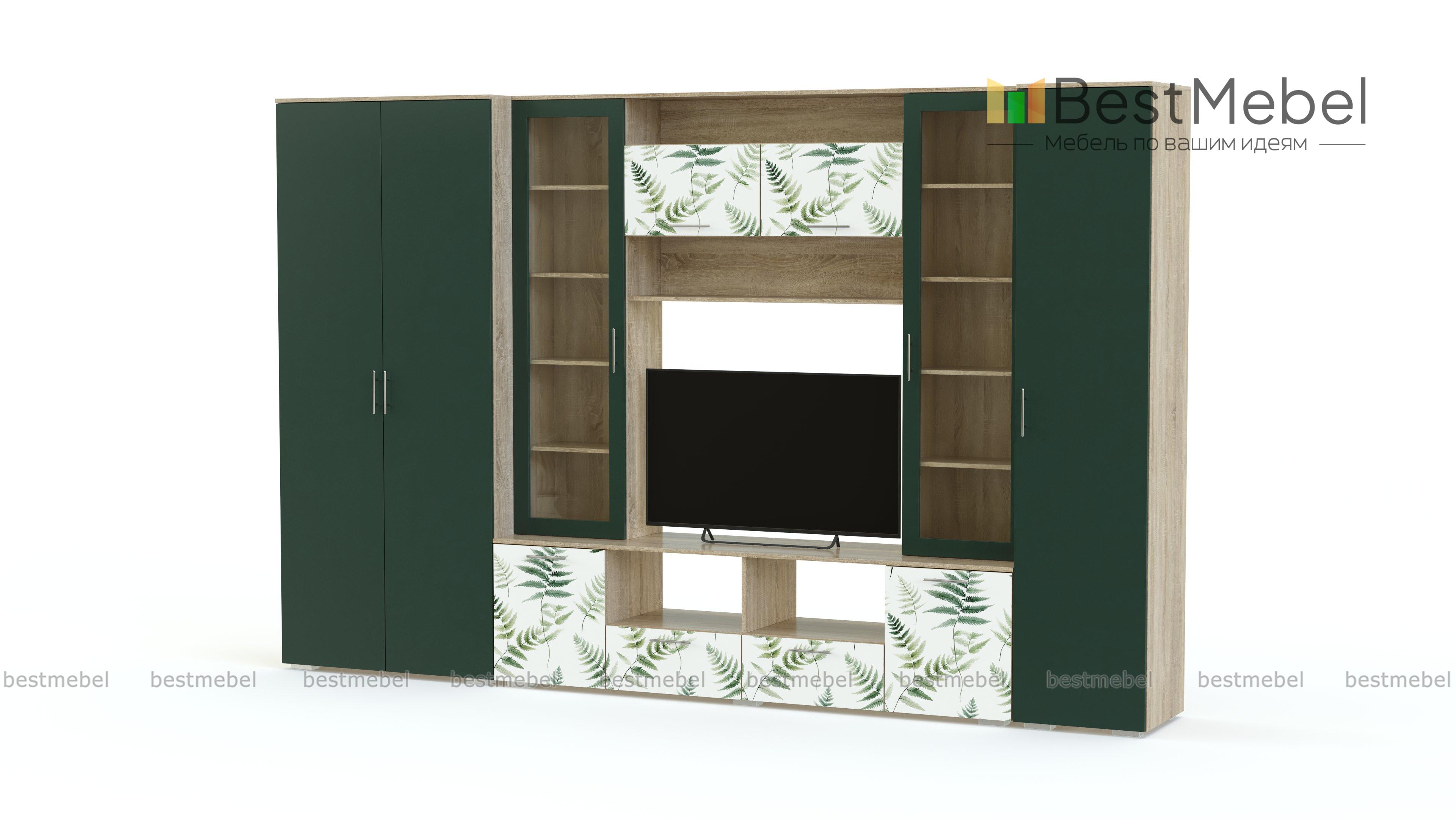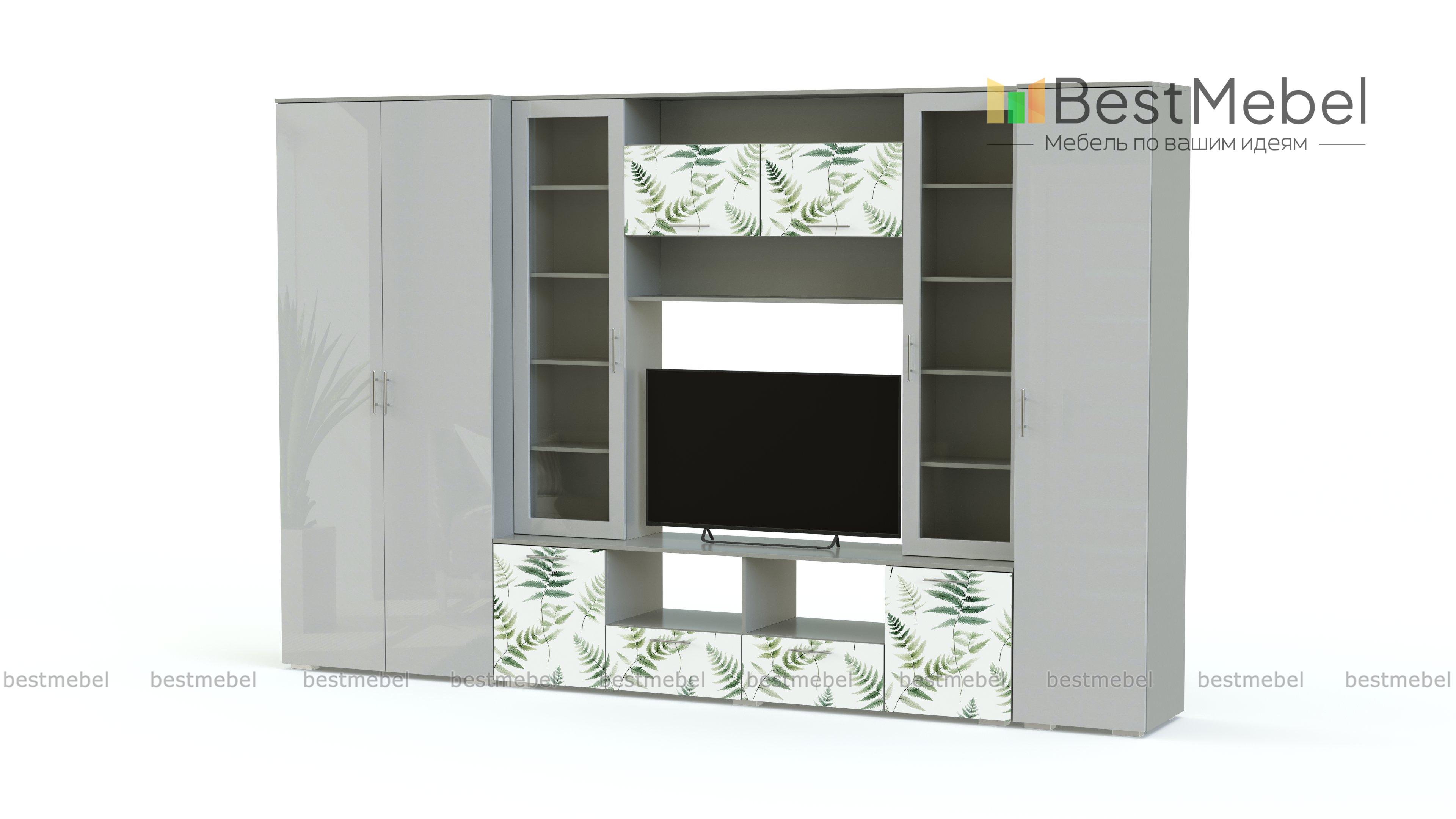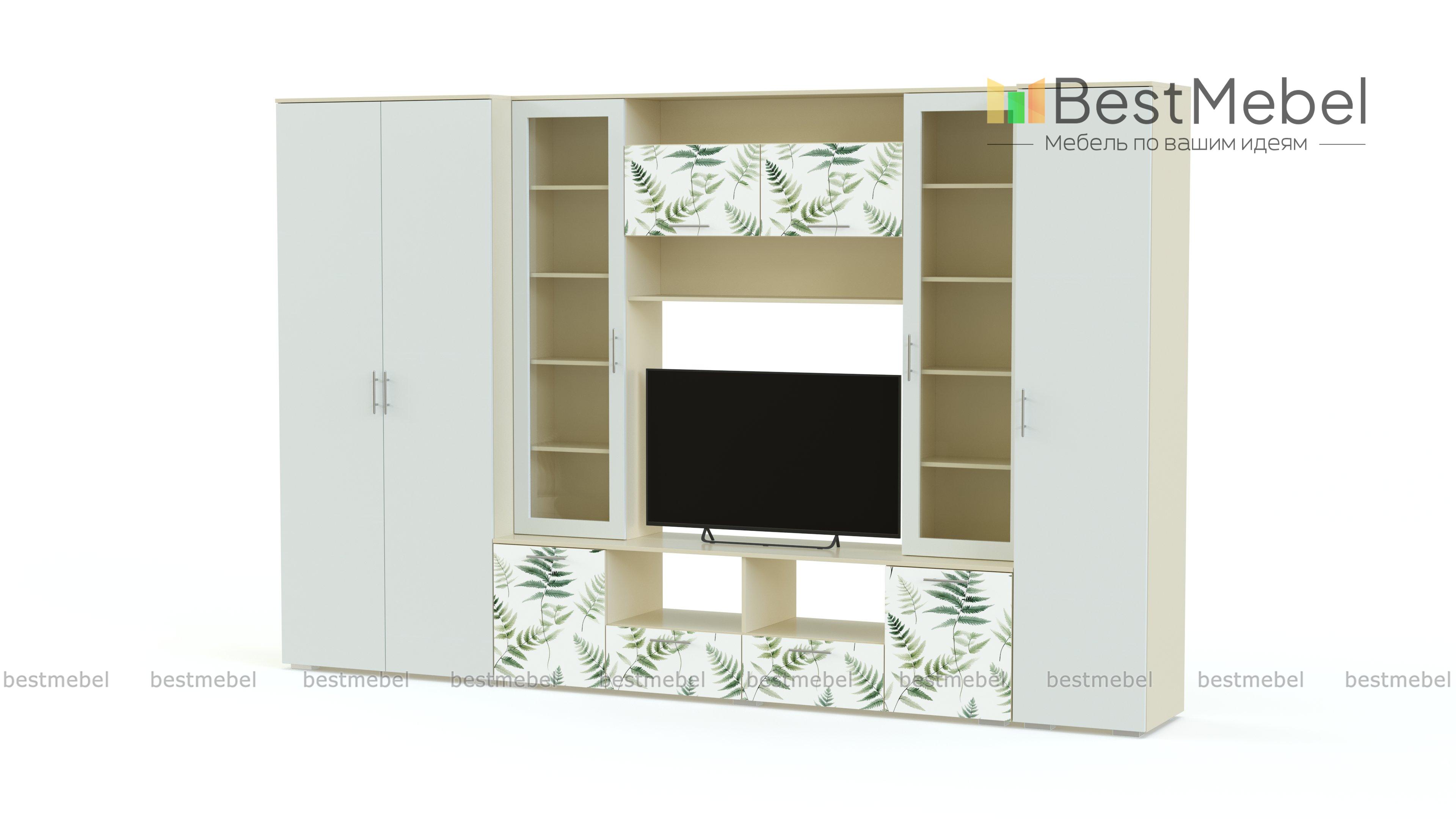 Стенка для гостиной Долли 12 BMS освежает интерьер и вносит в него элементы трендового экостиля. Современная композиция в природных оттенках объединила все необходимое для обустройства телезоны и хранения вещей: тумбу под аппаратуру, две витрины и книжную полку, а также распашной шкаф и пенал. Акцентное решение для фасадов - утонченная растительная фотопечать. Купить стенку для гостиной Долли 12 BMS с выбором размеров, цвета и фурнитуры вы сможете в нашем интернет-магазине.