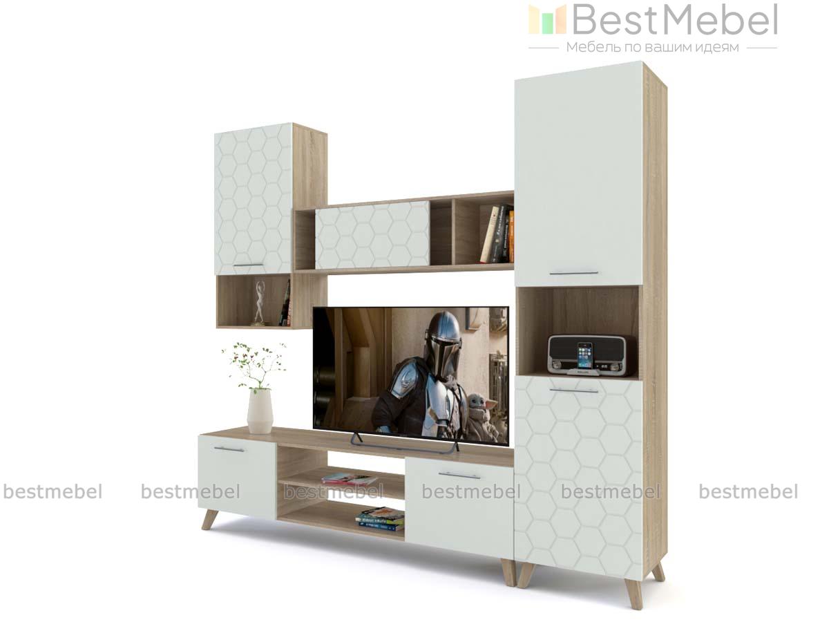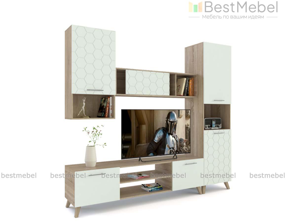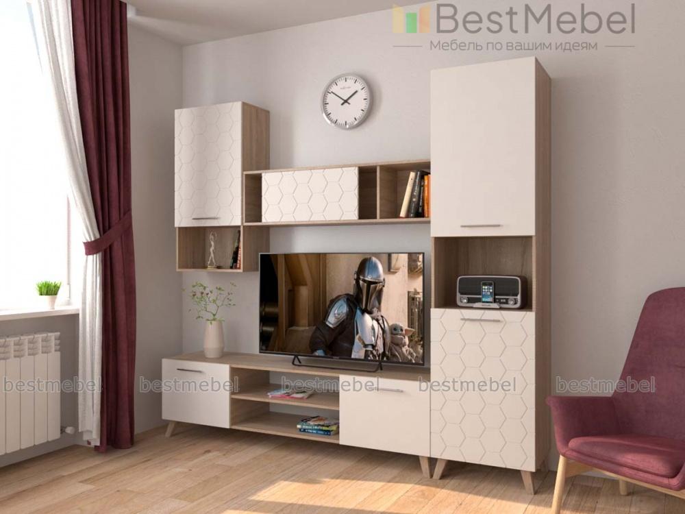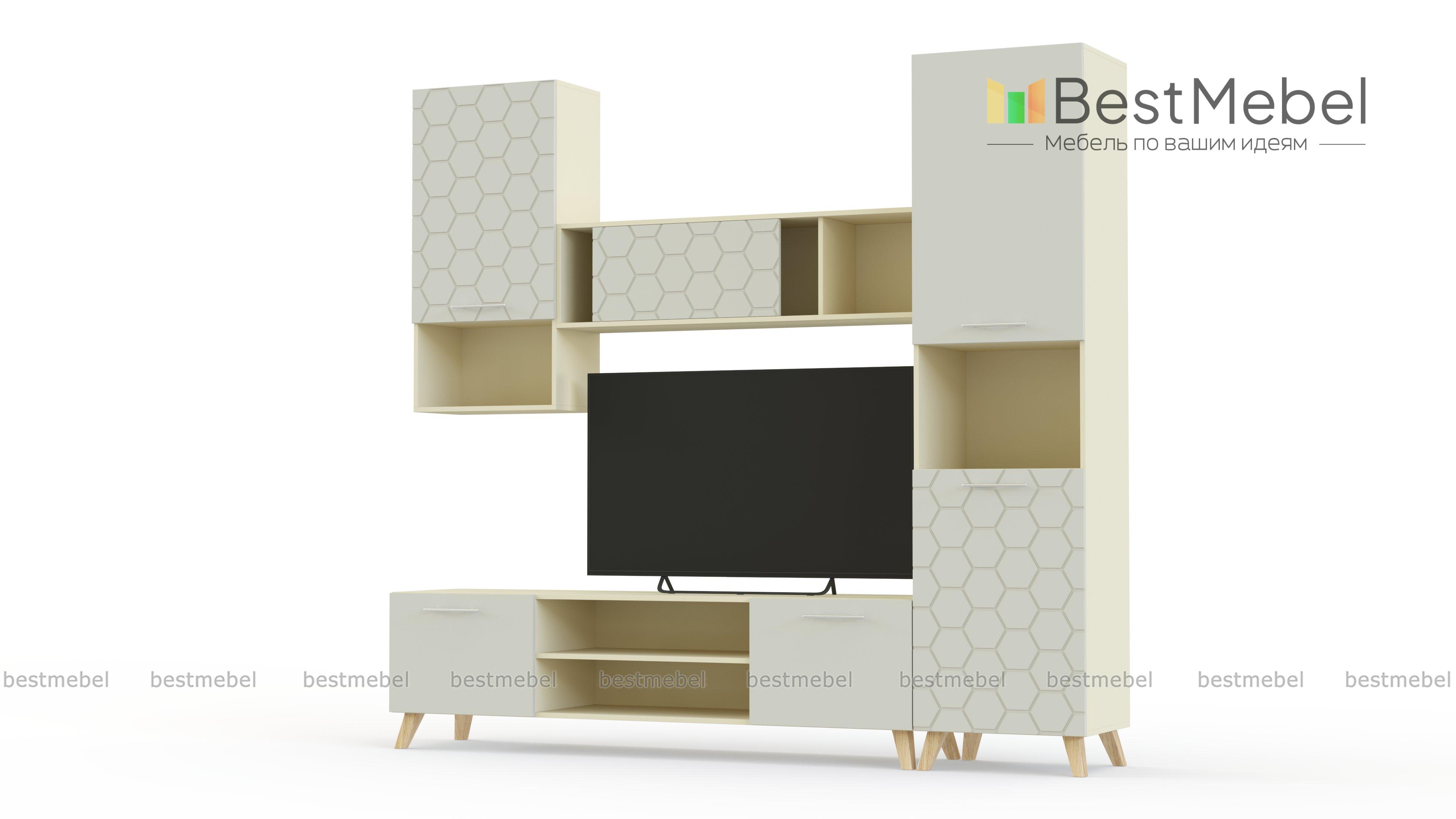 Стенка для гостиной Ромира 9 BMS состоит из отдельных модулей, которые легко комбинируются между собой. Композиция для оформления зоны ТВ включает в себя низкую тумбу под аппаратуру с нишами, пенал с открытой секцией, навесной распашной шкафчик и книжную полку. Визуальную легкость предметам придают высокие скошенные ножки и сочетание светлых бежевых тонов с фрезеровкой. Купить стенку для гостиной Ромира 9 BMS вы сможете в нашем интернет-магазине по доступной цене.
