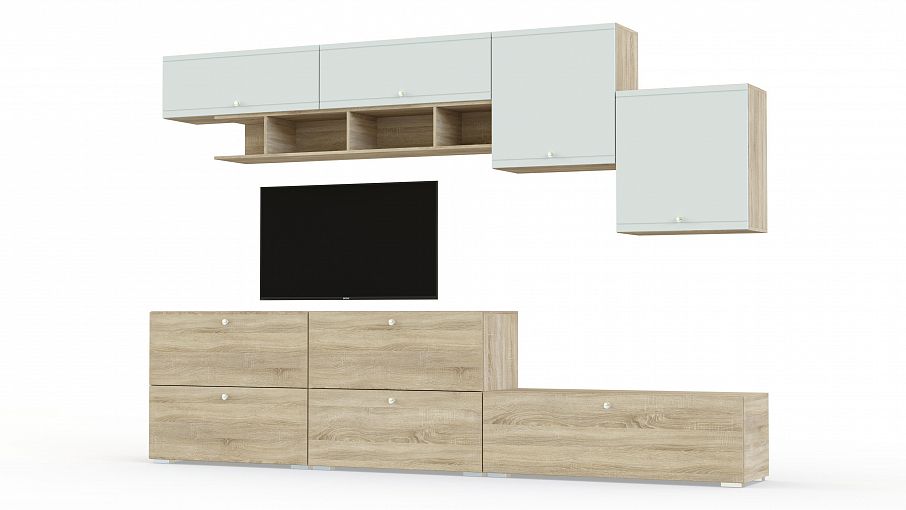 Стенка Лайн 1 BMS – это стильная разноуровневая композиция, включающая в себя напольные и навесные элементы. Выполненная в комбинации древесных тонов и белого с лаконичной фрезеровкой, стенка эффектно дополнит современные интерьеры и нестандартно оформит зону ТВ. В комплекте три тумбы с выдвижными ящиками, два навесных распашных шкафчика, полки с открывающимися вверх дверцами и открытая книжная. Купить стенку Лайн 1 BMS вы сможете в нашем интернет-магазине по выгодной цене.