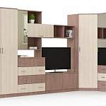 Стильно и недорого обставить просторную гостиную вам поможет симпатичная и функциональная стенка Ронда Композиция 3 BMS. В ее составе большое количество модулей, удобных для хранения предметов семейного гардероба, книг и мелочей. Комбинированный шкаф с зеркалом и выдвижными ящиками, угловой элемент, двухдверный одежный шкаф и центральная секция с комодом, нишей под ТВ и оригинальными закрытыми полками образуют единую гармоничную композицию.