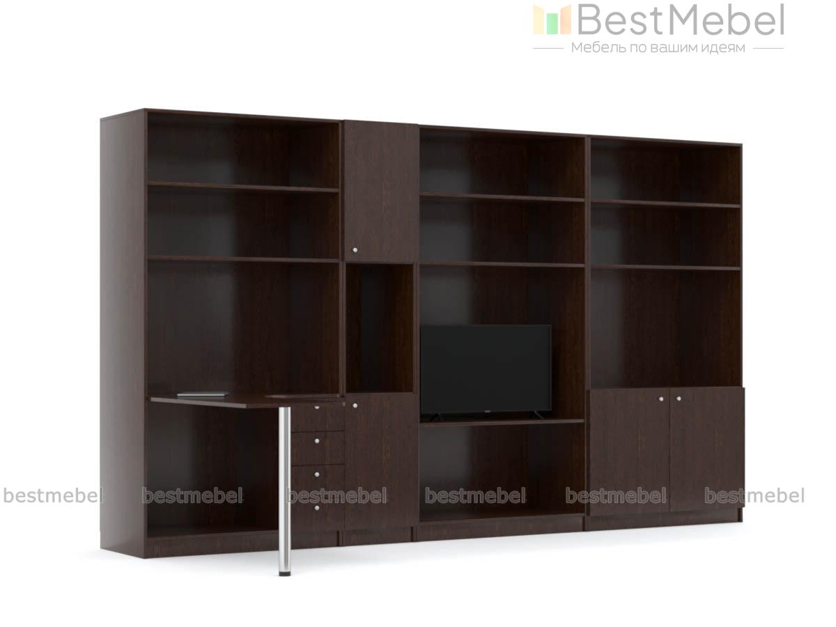 Стенка с рабочим местом Мавра BMS – это элегантная современная композиция в темном венге для меблировки гостиных или молодежных комнат. В комплект входят комбинированный книжный шкаф, пенал с нишей, секция с открытыми полками под ТВ, видео- и ауодиоаппаратуру и шкаф, совмещенный с угловым компьютерным столом. Практичная конструкция позволит гармонично вписать в интерьер зону ТВ и комфортное рабочее место. Купить стенку с рабочим местом Мавра BMS вы сможете в нашем интернет-магазине.