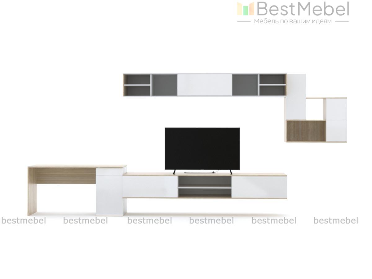 Стенка с рабочим местом Тельма BMS включает в себя все необходимое для оформления зоны ТВ и организации комфортного рабочего места. Практичное решение для молодежной комнаты или студии, композиция объединила однотумбовый письменный стол, широкую тумбу с нишами под аппаратуру и вместительные навесные полки с открытыми и глухими отделениями. В оформлении использованы древесные тона и универсальный белый. Купить стенку с рабочим местом Тельма BMS приглашаем к нам в интернет-магазин.