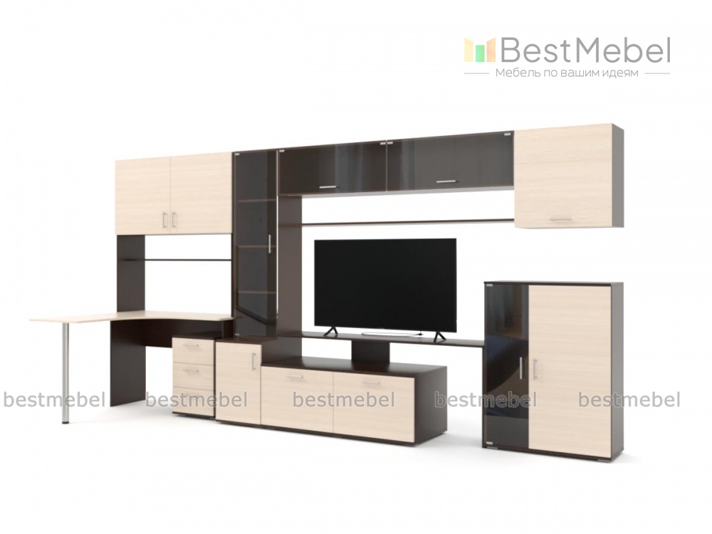 Стенка со столом Карла 2 BMS позволит сэкономить пространство и вписать в интерьер гостиной или студии рабочее место, зону ТВ и удобную систему хранения. Композиция объединила широкую низкую тумбу под аппаратуру, высокую тумбу с витриной, комбинированный шкаф, навесные полки для книг и предметов декора, а также угловой компьютерный стол с тумбой и надстройкой. Лаконичная по форме и выполненная в контрастных древесных тонах, стенка универсальна для современных квартир. Купить стенку со столом Карла 2 BMS приглашаем в наш интернет-магазин.