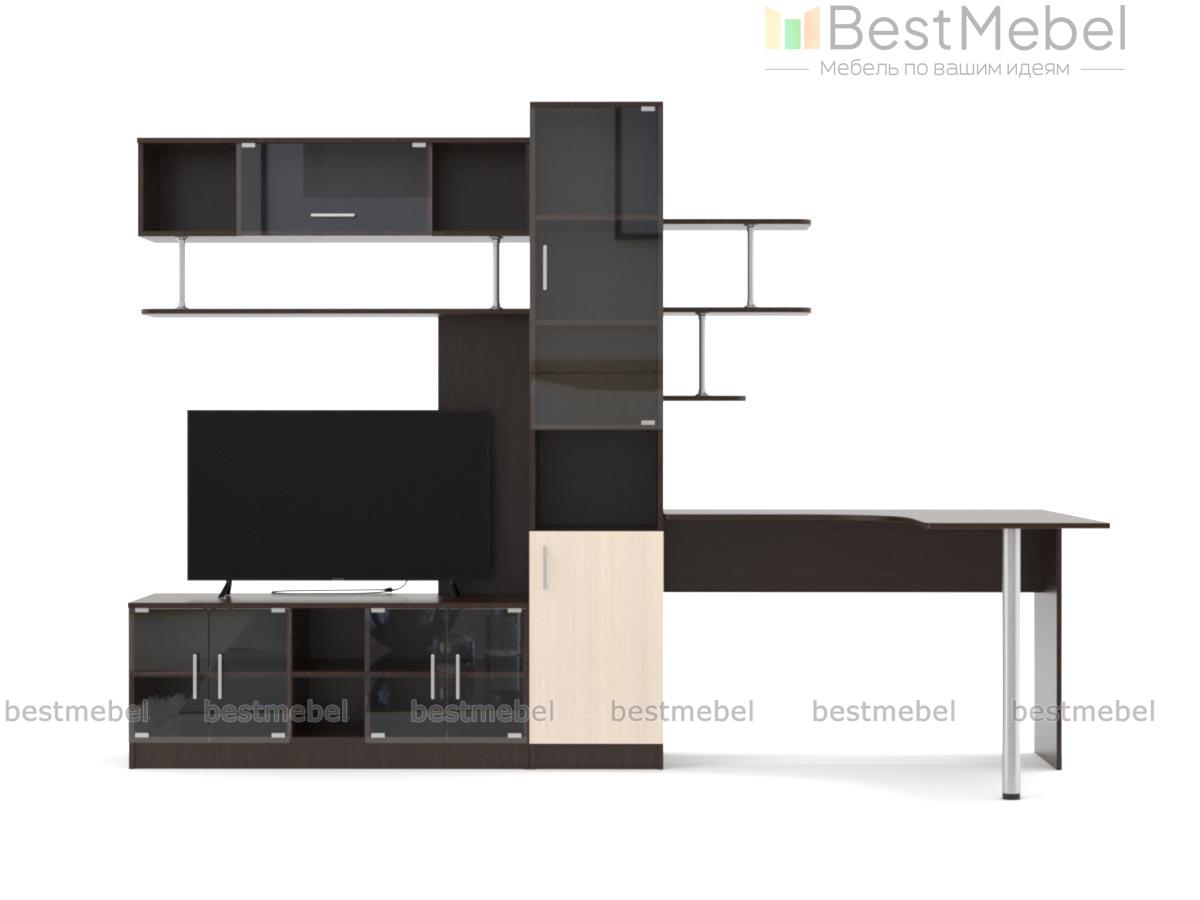 Стенка со столом Майя BMS отличается миниатюрными размерами и станет находкой для владельцев малогабаритных квартир и студий. Композиция включает в себя широкую тумбу под ТВ, стеллаж, комбинированную витрину, угловой письменный столик и полки для книг и декоративных мелочей. Выполненная в темных древесных тонах, стенка эффектно смотрится с хромированными элементами. Купить стенку со столом Майя BMS приглашаем в наш интернет-магазин по демократичной цене.