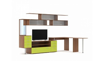 Стенка со столом Роуз BMS подходит для меблировки небольших квартир и студий, позволяя вписать в ограниченное пространство рабочее место, зону ТВ и туалетный столик. Многофункциональная композиция объединила угловой компьютерный стол с приставным элементом, широкую тумбу под аппаратуру, тумбу с четырьмя выдвижными ящиками, дополненную зеркалом, и навесные полки с открытыми и застекленными фасадами. Купить стенку со столом Роуз BMS, выполненную в сочетании древесных тонов и фисташкового глянца, приглашаем в наш интернет-магазин.