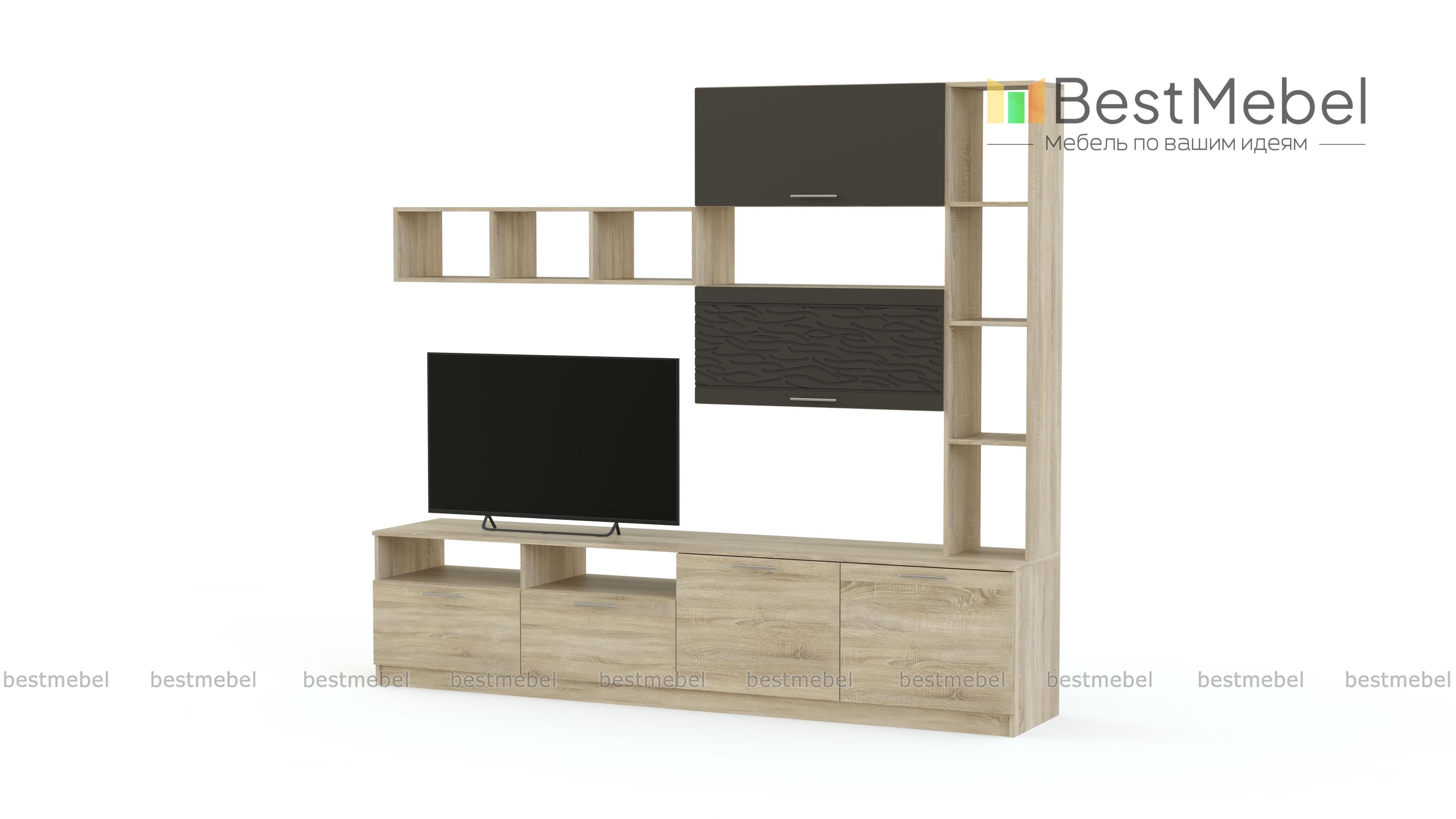 Стенка Вельвет 2 BMS из серии современных модульных комплектов выполнена в характерном сочетании древесных тонов и терракотового оттенка. Скромные размеры стенки отлично впишутся в малогабаритные квартиры и студии, а лаконичный дизайн не будет перегружать помещение лишними деталями. Разместить ТВ, книги, предметы декора и разнообразные мелочи помогут практичные модули – широкая низкая тумба, мини-стеллаж, одна открытая и две закрытые навесные полки. Интересный акцент – модный фрезерованный рисунок. Купить стенку Вельвет 2 BMS вы всегда сможете в нашем интернет-магазине.