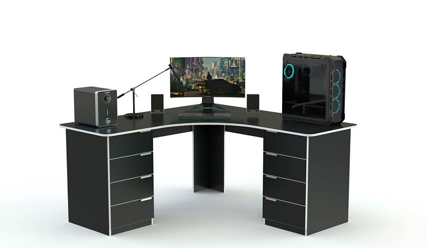 Игровой стол Некст-11 BMS выполнен в черном цвете, который не будет отвлекать от игры, а контрастная кромка эффектно подчеркнет минималистичный дизайн модели. Двухтумбовый стол оборудован просторной столешницей, но при этом не занимает много места благодаря угловой конструкции. Для хранения под рукой рабочих материалов предусмотрены восемь вместительных выдвижных ящиков. Купить игровой стол Некст-11 BMS с учетом необходимых размеров вы сможете в нашем интернет-магазине.