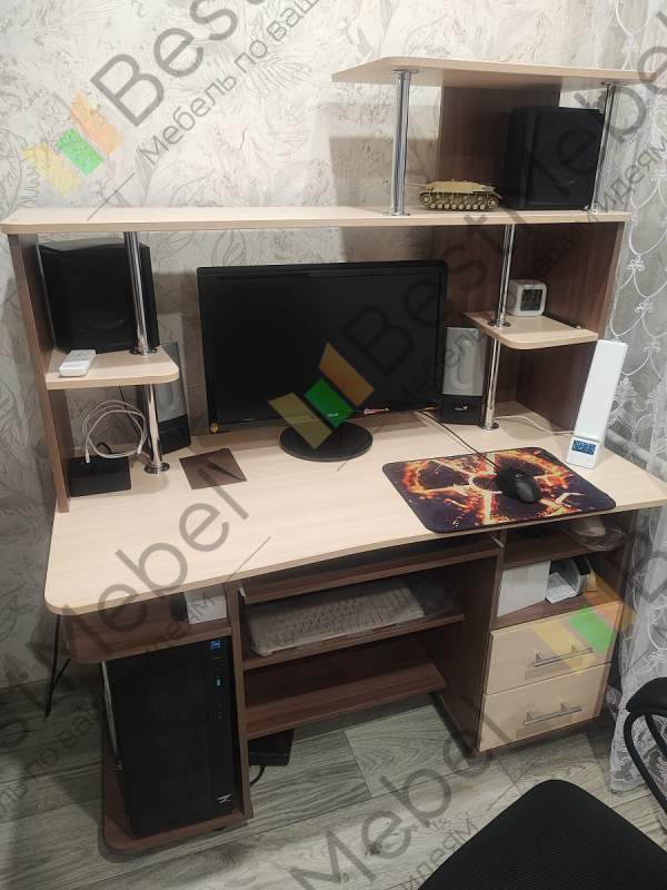 Приобрел данный стол пару месяцев назад. Стол очень понравился. Только полочку вторую снизу можно было бы сделать поуже, чтобы колени не упирались. Так же понравилось что на сайте можно самому конструировать и подбирать что тебе надо. А потом ещё и в 3d посмотреть. Номер заказа 00000919488.