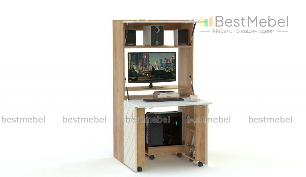Компьютерный стол-трансформер Принстон 10 BMS отличается ярким современным дизайном, а практичная конструкция делает его удачным выбором для небольших помещений. Высокий шкаф с фрезерованным фасадом легко превращается в рабочее место при помощи откидной столешницы и опорных створок с закрепленными изнутри полками. Модель оборудована подставкой под монитор и верхней полкой для периферийных устройств, а также мобильной подставкой для системного блока. Купить компьютерный стол-трансформер Принстон 10 BMS приглашаем выгодно в наш интернет-магазин.