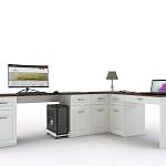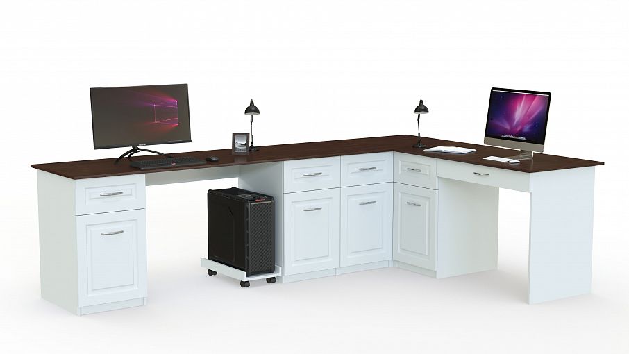 Угловой письменный стол для двоих Веста 5 BMS станет залогом успешной работы и сэкономит полезную площадь комнаты. Выполненная в элегантном классическом стиле, модель декорирована по фасаду фрезеровкой. Под просторной столешницей располагаются вместительные тумбы с выдвижными ящиками разной глубины для удобного хранения канцелярских принадлежностей и рабочих материалов. Купить угловой письменный стол для двоих Веста 5 BMS вы сможете в нашем интернет-магазине по отличной цене.