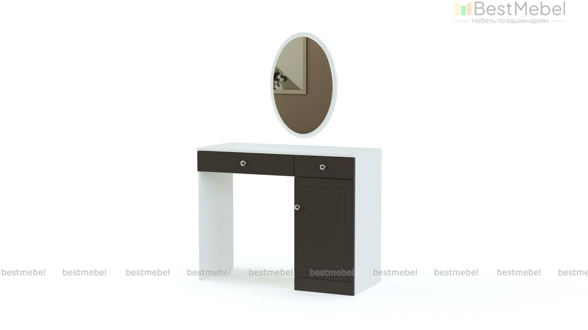 Стол туалетный Ева-11 BMS гармонично дополнит другие предметы серии и сделает спальный интерьер более комфортным и функциональным. Столик с широким выдвижным ящиком для мелочей под столешницей и оборудованной ящиком и распашным отделением тумбой дополнен навесным овальным зеркалом. Корпус в светлых тонах с имитацией фактуры дерева эффектно контрастирует с темно-зеленым фрезерованным фасадом. Купить стол туалетный Ева-11 BMS вы сможете в нашем интернет-магазине, по желанию изменив цвет и размеры.