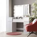 Туалетный столик Хлоя 12 BMS гармонично впишется в современный спальный интерьер и сделает комнату более уютной и атмосферной. Белоснежная модель современного дизайна включает в себя несколько практичных модулей: две тумбы – с выдвижными ящиками и комбинированную, столик с просторной рабочей поверхностью и ящиком для мелочей, а также горизонтальное большое зеркало в эффектной окантовке из лампочек. Благодаря ровному освещению нанесение макияжа будет особенно комфортным. Купить туалетный столик Хлоя 12 BMS вы сможете в нашем интернет-магазине.