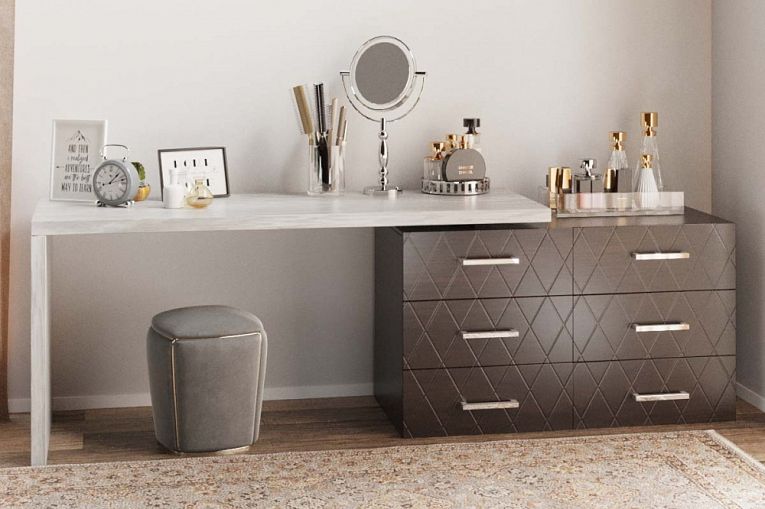 Туалетный столик Сая BMS сочетает в себе современный дизайн и функциональность. Модель, объединившая комод с шестью выдвижными ящиками и просторную столешницу, не только разместит большое количество вещей, но и может использоваться для работы, творчества или ухода за собой. Строгие линии композиции подчеркивает сочетание нейтрального серого и имитации текстуры дерева, фасады комода декорированы фрезеровкой. Купить туалетный столик Сая BMS приглашаем в наш интернет-магазин.