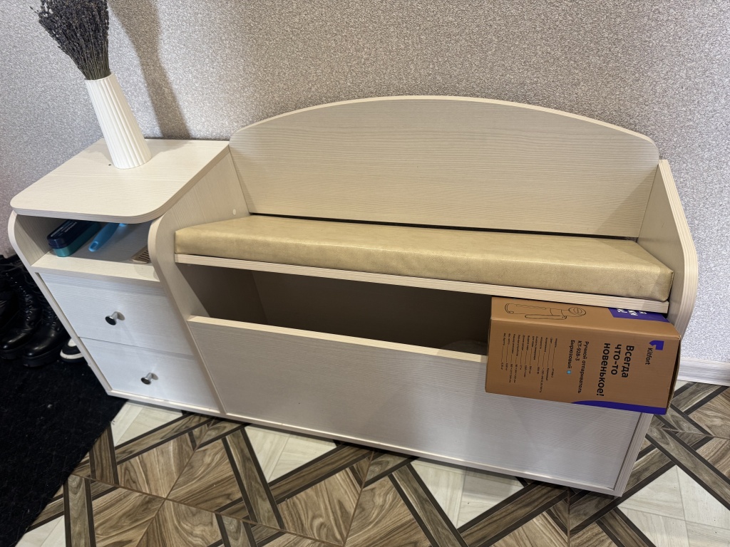 Тумба для обуви классная.Очень симпатично смотрится. Удобная и вместительная.Сидушка мягкая экокожа светлая.