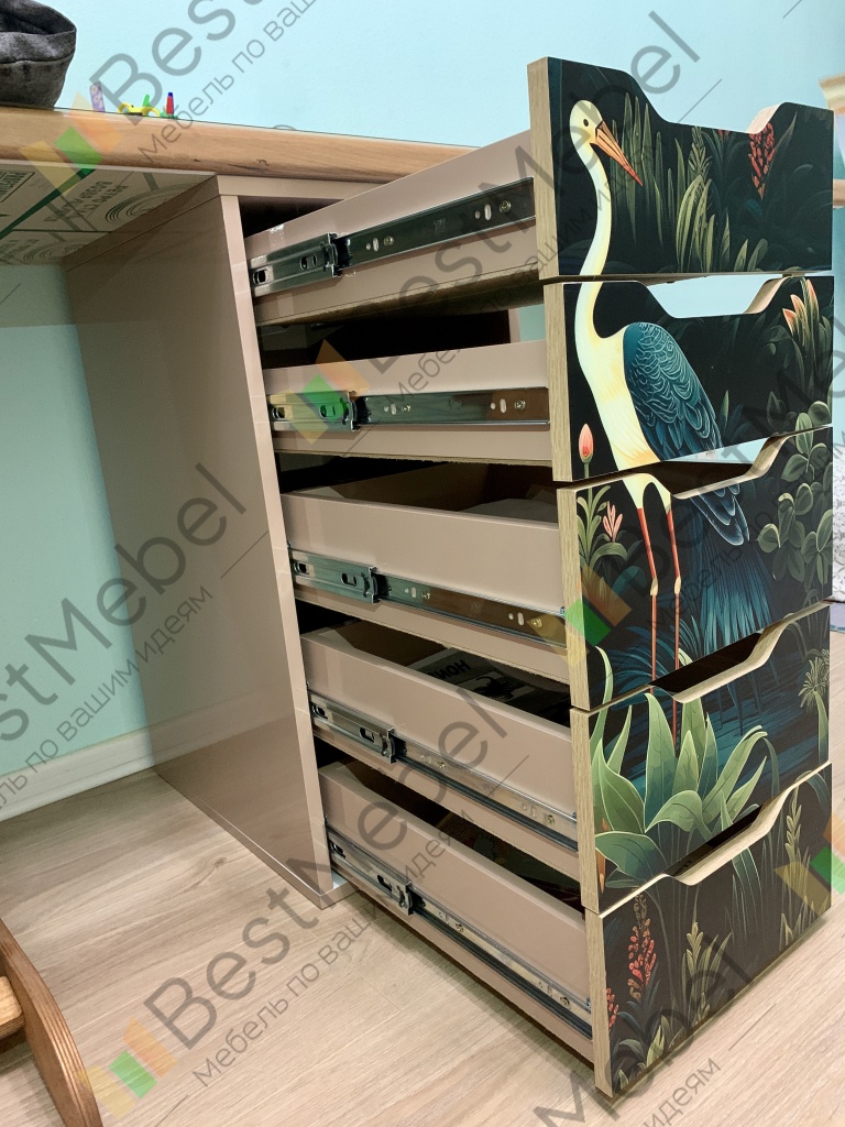 в этом заказе всё индивидуально: глянцевый корпус, в т.ч. задняя стенка, скрытые крепежи, шариковые направляющие с доводчиком, фотопечать, материал мдф. Получилось мощно! Мы довольны. Выполняет функцию разделителя под детским столом.
