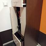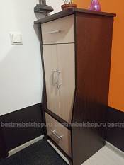 Высокая, вместительная тумба. Комплектацию покупал самую простую. В целом доволен. Есть два типа полок: верхний и нижний ящик, посередине распашная больная полка. Достаточно удобно. Плюс сверху удобно класть мелочи, что должно быть под рукой. За свои деньги очень удобная конструкция. Места занимает мало, хоть и кажется первое время отдельным шкафом, но на самом деле функциональная и удобная тумба.