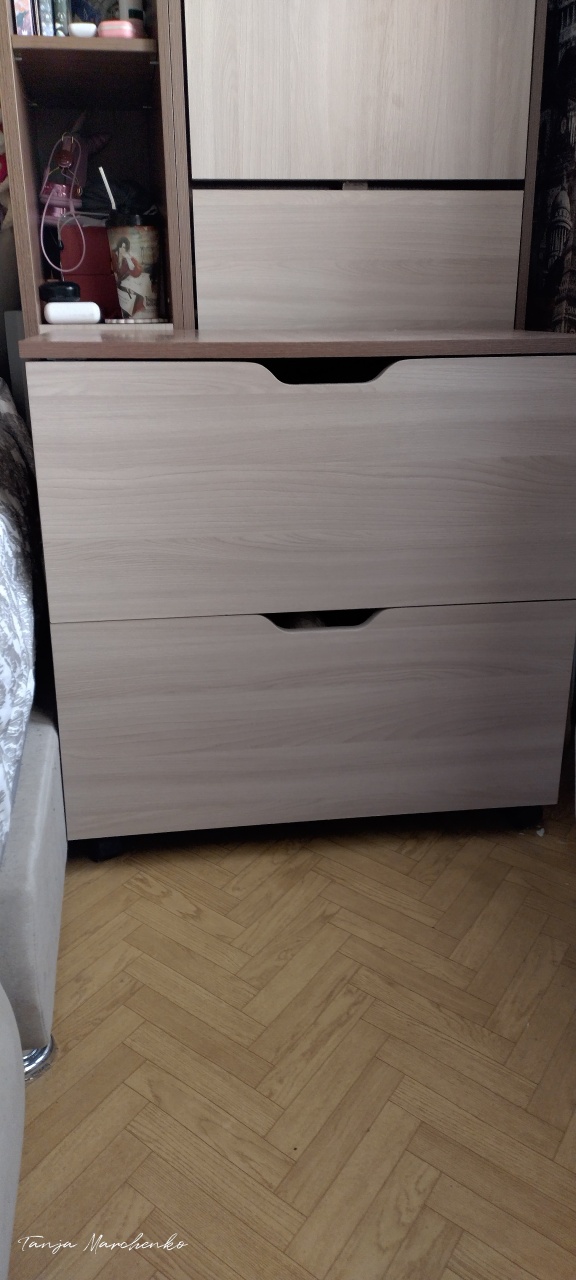 Отличная тумба. Собирается легко. Брала для хранения ниток. На верхний ящик пришлось установить магнит, так как кот очень легко его открывает и спит в нем))). Мой косяк в том, что нужно было глубину делать больше. Не все нитки влезли)))