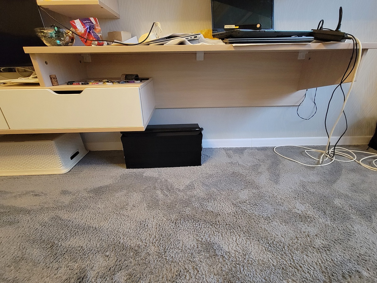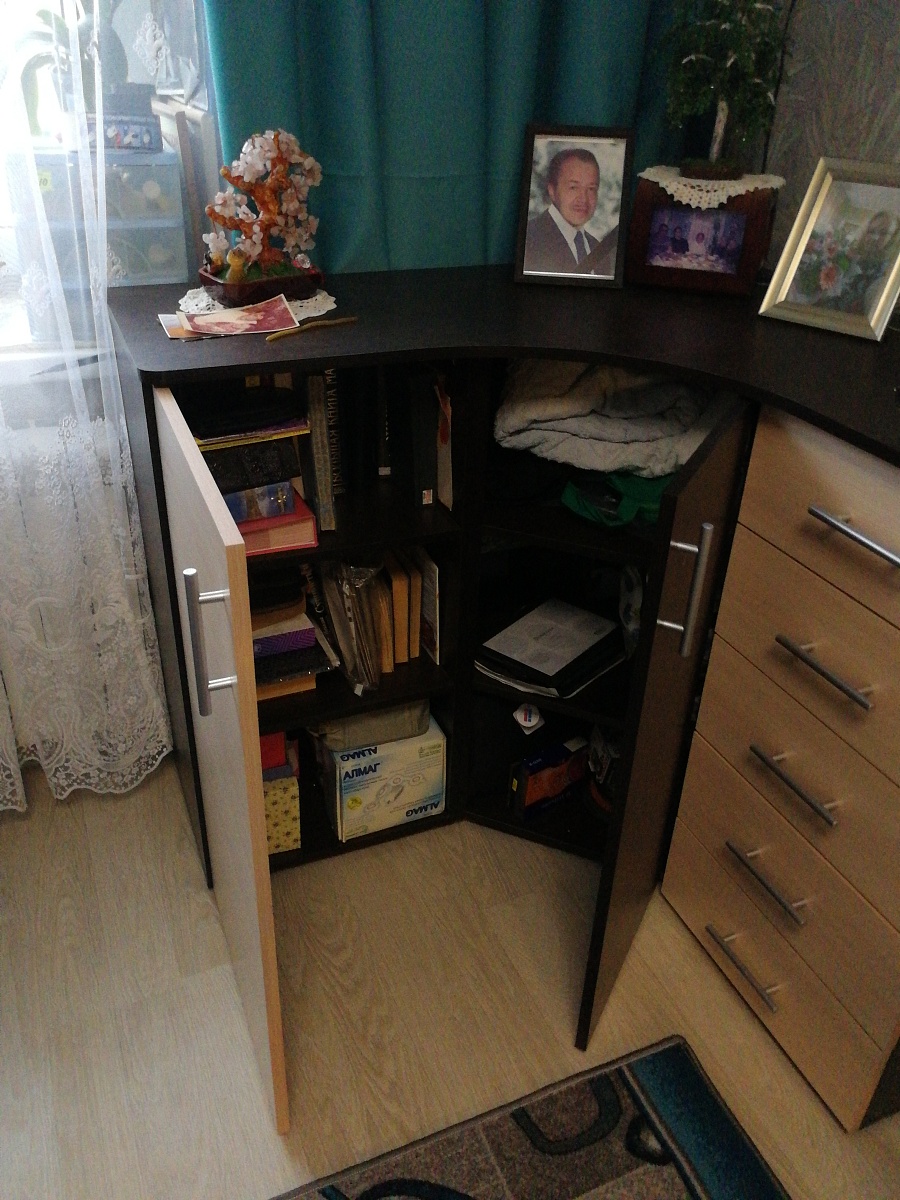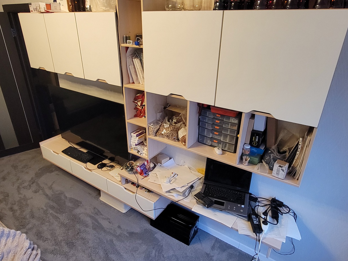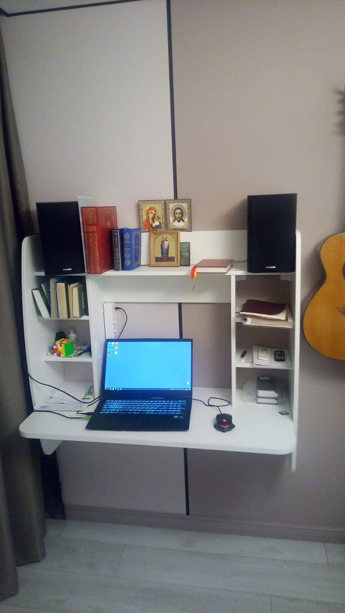 Приобрёл навесной стол длиной 1000 мм.Собрал и подвесил сам без проблем - нормальная инструкция, сборка несложная, повозился только с монтажом.В центральной нише расположил ноут, и для мыши места осталось мало. Так что лучше при такой компоновке брать подлиннее стол. Ячейки по бокам невысокие, из-за чего они неудобные для использования. Если было бы выполнено только одно разделение, получилось бы лучше.