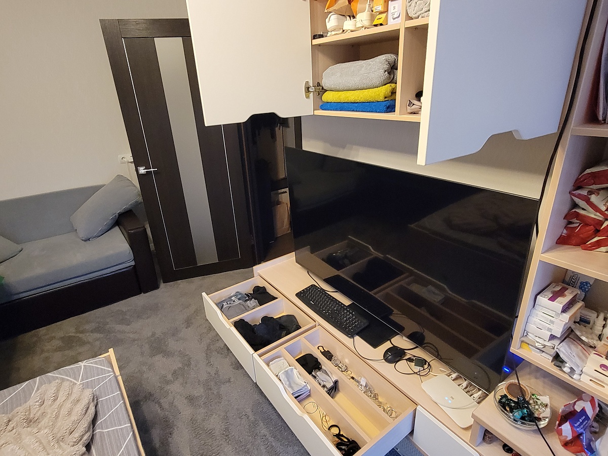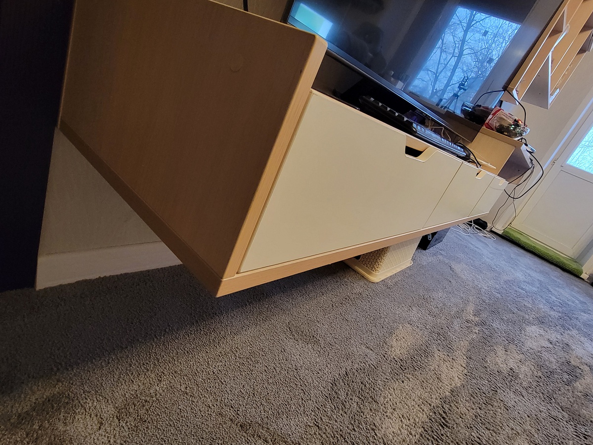 Стенка шикарная - по дизайну и по удобству. Можно настроить размеры на сайте, чтобы не сильно отстояла от стены. Если прикрутить к стене крепко - выдержит вес человека, стоящего на ней.При стандартной ширине ниша для ТВ идеально подошла для диагонали 55".Верхняя и нижняя часть друг с другом не связаны и самый большой геморрой - повесить их так, чтобы висели ровно.