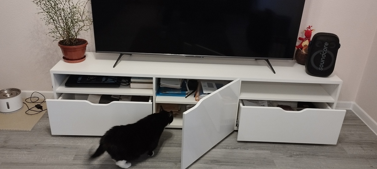 Заказ 1104688, тумба под телевизор.Спасибо, отличная тумба, хорошо вписалась в гостиную. Заказывала под свои размеры - спасибо интернет-магазину, очень удобная навигация.Единственное пожелание - доработать выпилы вместо ручек - слишком мелкие, приходится подхватывать ящик или дверцу ногтями, поэтому снимаю одну звезду.В остальном всё отлично - детали подогнаны хорошо, нигде никаких перекосов или выступов.