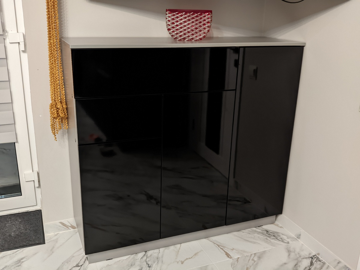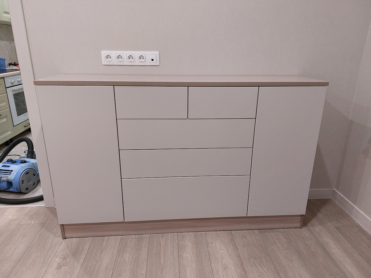 Подбирали функциональный и в то же время стильный комод в уже обставленную кухню-гостиную в дом. Во первых очень удобно, что можно сформировать габариты и цветовую гамму прямо на сайте и отправить заказ в работу - отличная передовая технология! Так же удобно, что доставка от фирмы, т.е. она заботится о максимальной сохранности товара для нас. И очень быстрый срок изготовления и доставки! С нашими размерами комод приехал в Анапу меньше чем за пять дней! Качество хорошее, с каждым вложенным рублём, скорее всего, станет лучше, но мы остановились на равновесии цены и качества ) Детали отлично обработаны, подходят при сборке хорошо, ДСП корпуса плотный, винты не прокручиваются. Самый не удобный минус - отсутствие на схеме номеров, наименований или артикулов деталей. Но в принципе и так всё собирается, только фасады ящиков нужно примерять на собраном комоде! С торцевыми ручками на ящиках и дверях удобнее открывать и смотрелось бы ещё симпатичнее. Фурнитуры с запасом, глянцевые фасады все закатаны в надёжную пленку при доставке - царапин не было. В целом мы довольны, спасибо производителю!