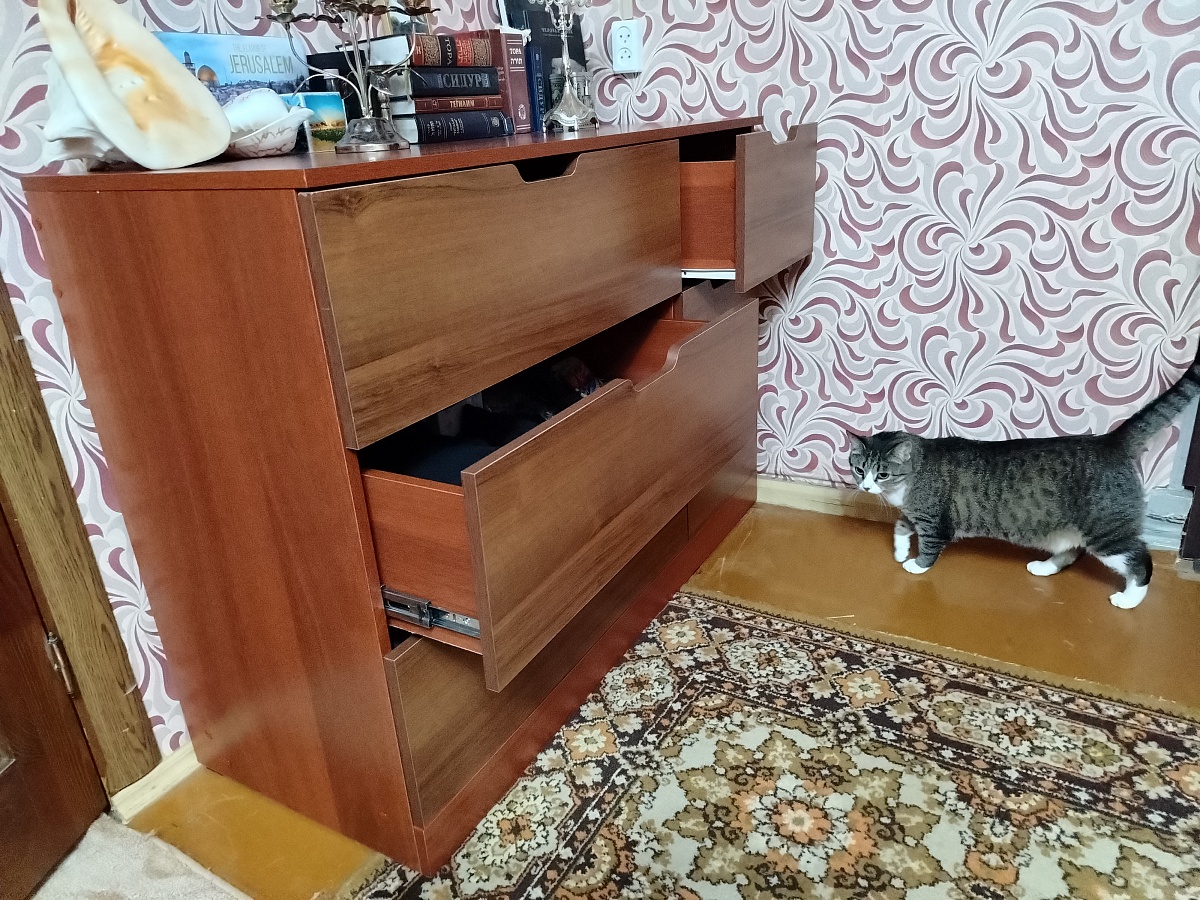 Заказ 00000867485. Приобретали комод. Нужен был длинный. Сайт очень удобный, можно выбрать и цвета и размеры. Понравилось, что есть возможность разного цвета корпуса и фасадов. Изготовили очень быстро, быстрее, чем по договорённости. Доставка вовремя. Качество хорошее, каждая деталь маркирована, легко собирается. Мы всем довольны, спасибо.