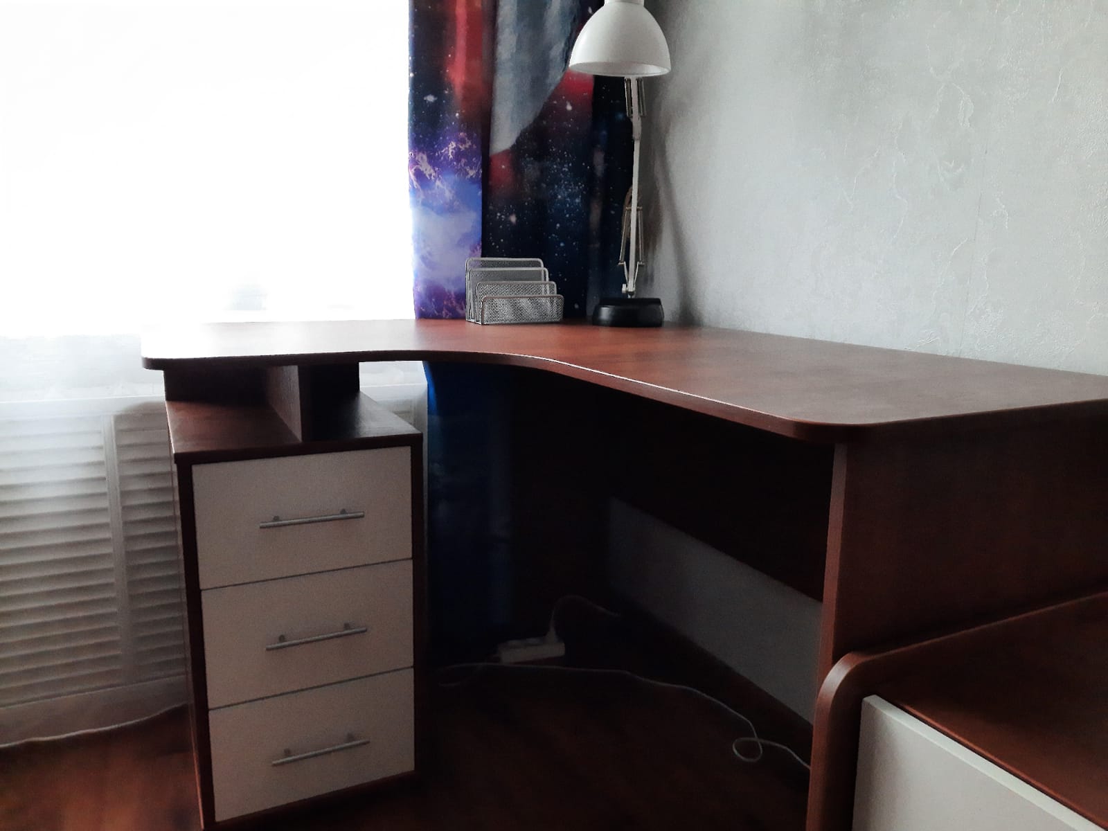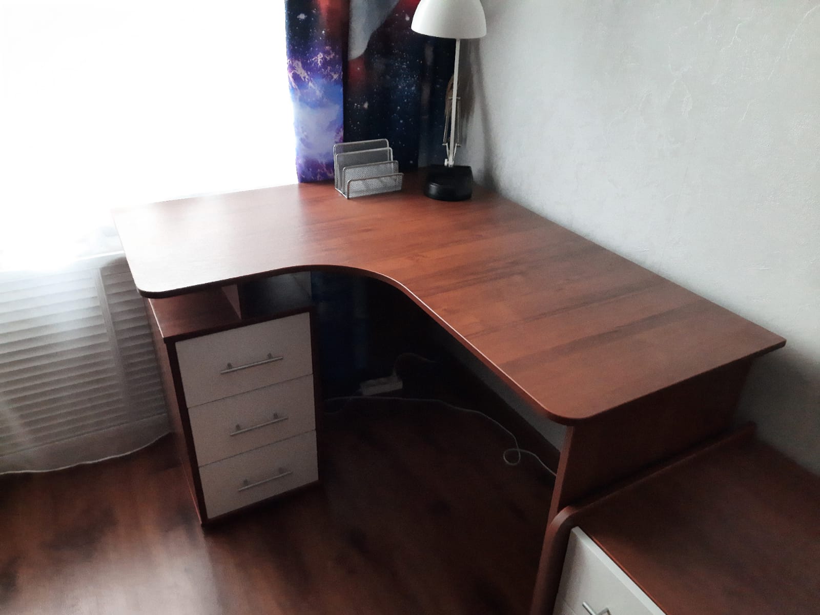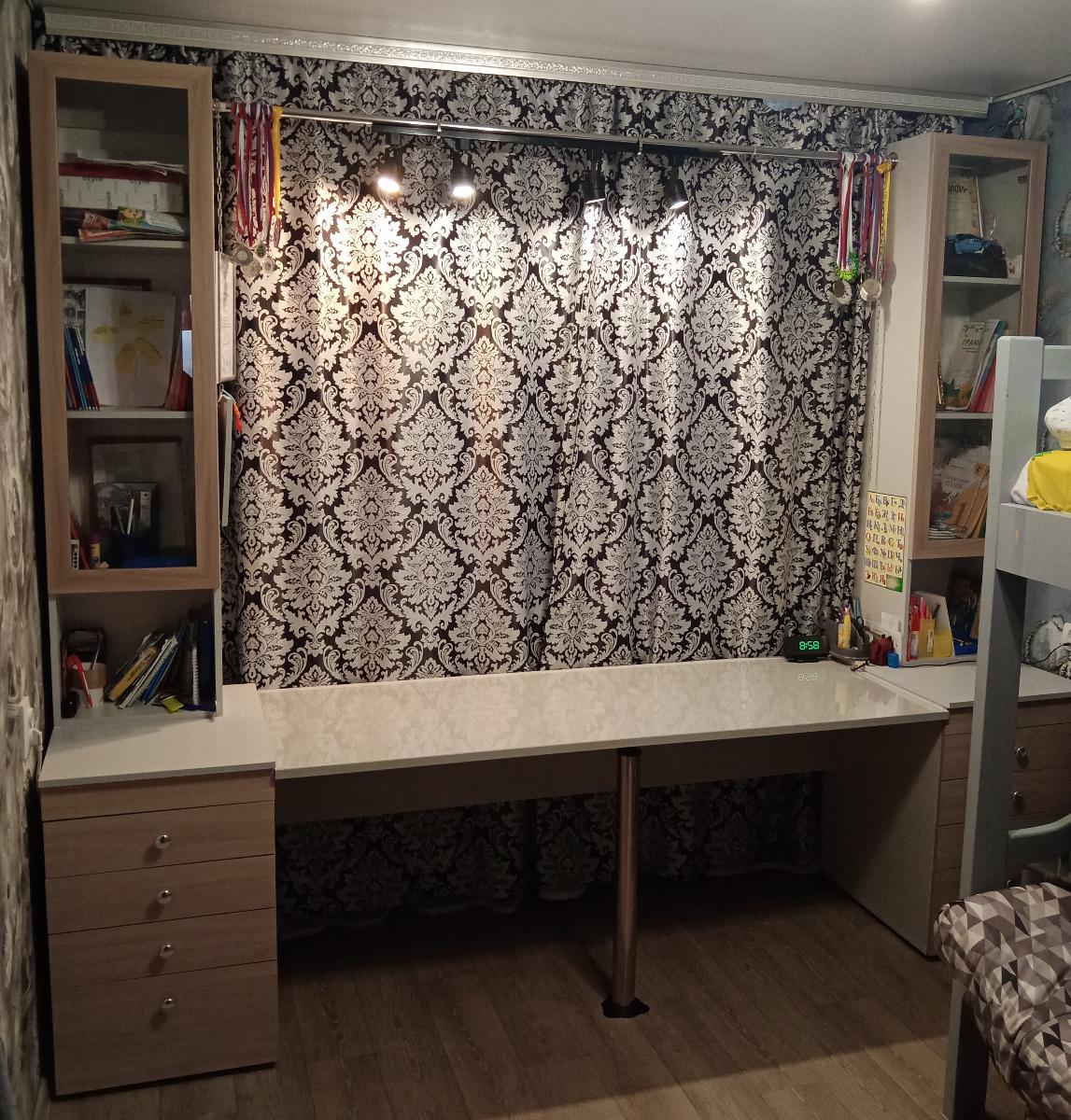 Купили такой стол несколько месяцев назад. Заказали в стандартной комплектации за исключением: столешницы (толщина 20мм - для надёжности), петли на створках двери с доводчиком (чтобы не хлопать, т.к. дверки достаточно тяжелые), дополнительно заказали круглые смягчители под опоры в пол (но они оказались не подходящими, т.к. стол ОЧЕНЬ тяжёлый и толку от них - ноль). Отдельно купили центральную опору под столешницу, т.к. на неё приходиться залазить для мытья окна. Доработал самостоятельно сверху трубой-перемычкой, на которой разместил трековые светильники - для дополнительного освещения рабочего места и детские медали и грамоты. Отдельно хочу сказать по сборке - инструкция ОЧЕНЬ слабая и собирать по ней крайне сложно (могу сказать это, как человек, занимавшийся ранее сборкой мебели). Так же без помощи кого-либо, скорее всего, Вы вряд ли соберёте. Ещё, есть моменты, когда элементы собираются друг на друга и приходится соблюдать определённый порядок сборки (про который в инструкции не сказано). Если ты этого не учёл, то приходится разбирать уже собранные части, т.к. иначе собрать не получится (касается установки верхних шкафчиков на крышку нижних).В целом столом довольны - встал от стены до стены как и планировалось! Мощный, добротный, вместительный! Берите - не пожалеете, если хотите нечто подобное!