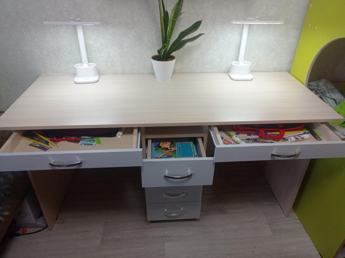 Приобрели данный стол для двойни, очень удобный и функциональный, самое то для маленькой квартиры, причём при заказе мы ещё меняли размер в сторону уменьшения длины столешницы, что практически не отразилось на цене, это очень приятно. Собрали легко сами, была подробная инструкция и что удобно - все детали были пронумерованы стикерами, что ещё больше облегчило сборку.Ящики вместительные и что важно : их 4! По два на каждого ребёнка, не будет споров кому сколько. И под рабочим местом очень вместительный ящик для ручек и мелочей. Очень довольны столом, у нас в городе таких не нашлось, спасибо вам за хорошую мебель! Номер заказа 00000448827