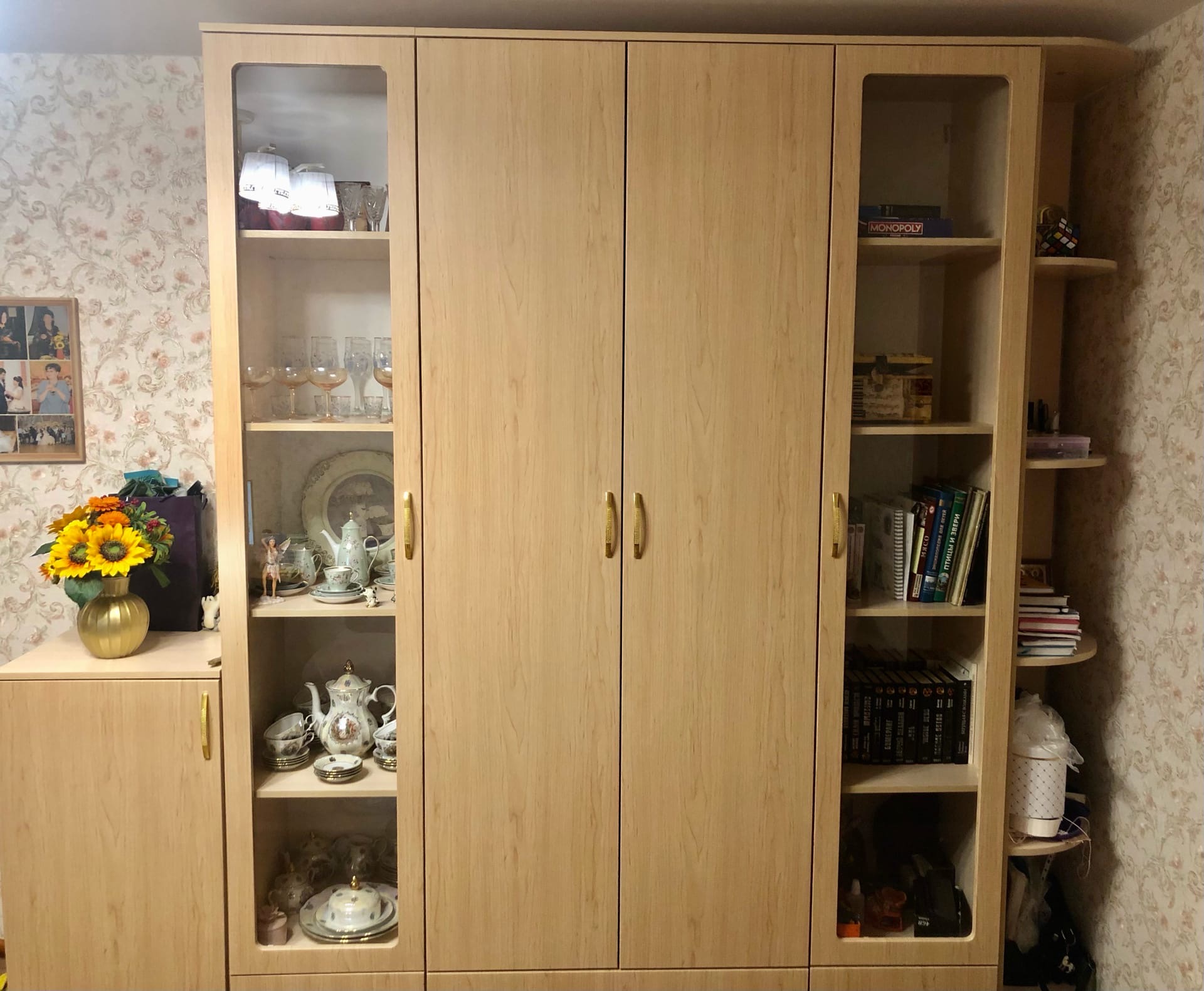 Заказ 00000548342. Заказали гостиную с основным цветом: "Береза", и дополнительным - "молочный дуб". Изменили немного строение комода - от этого цена стенки не изменилась, что очень порадовало.Нам очень понравилась стенка, хорошо смотрится в гостиной, есть место и для сервиза, и для книжек. Рекомендуем!