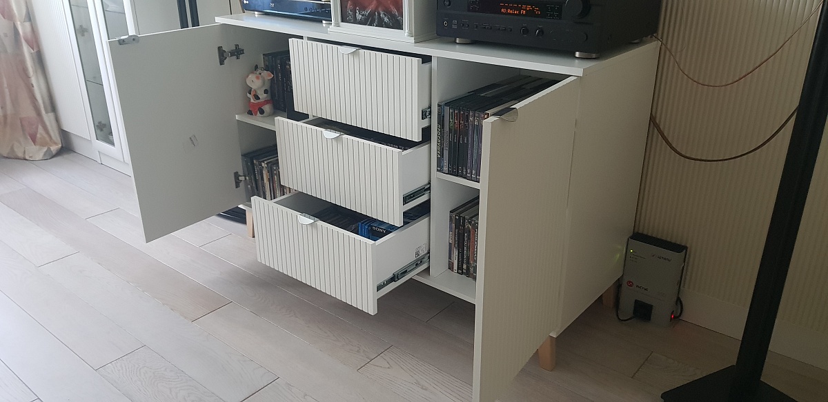 Года два или три, наверное, я всё не решалась заказать себе тумбочку под ТВ. Важно было подобрать размер и тут "о, чудо" это можно сделать!Выбрала я конечно не совсем тумбочку и как потом поняла ещё и не на ножках. Но этот вопрос оказался решаемым))Из минусов заказа:1. Нет на сайте схемы, пришлось расспрашивать по телефону.2. Не точное время доставки.3. Рейтинг товара 5, отзывов нет. Странно.4. При смене фасада с МДФ на ЛДСП что-то сумма меньше не стала)))) 5. Кромка не аккуратно сделана. Что-нибудь придумаю.6. Оказалось не мало деталей со сколами.7. Несколько поврежденных наклеек было тяжело убрать, клей пришлось снимать специальным средством, но хорошо снимались не повреждённые наклейки.Плюсы:1. Возможность сделать по своим размерам. У меня были 1730×600×400. Могла выбрать цвет и комплектацию.2. Несколько раз созванивались с менеджером, обговорили все детали, была выслана схема для утверждения. Моя душа успокоилась.3. Оплата по выбору. Можно и наличными и онлайн. Это здорово!4. Доставка. Ребята молодцы. Хоть нам и сказали другой день))) но они приехали на следующий, сами заехали, нас подождали, всё выгрузили. Вежливые, оставили о себе очень хорошее впечатление. 5. Есть схема сборки. Каждая деталь промаркерована и это очень удобно.6. Собирать легко. Собирали вдвоём с дочкой. Мы любители головой подумать и руками поработать))) Так что нам как игра была собрать этот комод-тумбу. Но было бы всё не так радужно, если бы не было всё вымерено чётко и правильно. Собралось всё без всяких погрешностей! Благодарю тех, кто воплощал в жизнь этот проект. Всё отлично получилось. Прикрепляю фото нашей совместной с вами работы. Удачи вам!