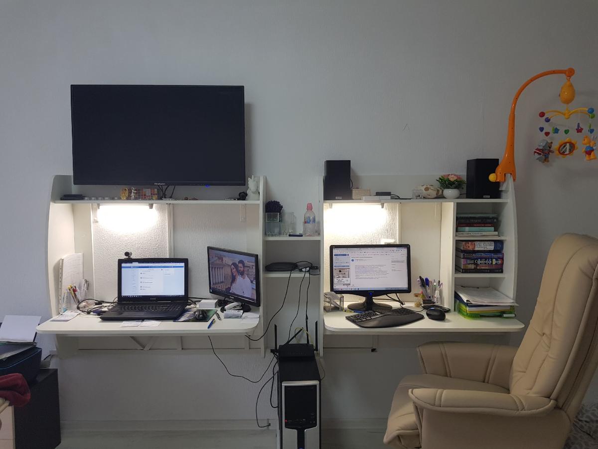 Шкаф нас удивил. Он оказался длинным и тонким (НЕ таким широким и коротким как на ваших картинках). Матового стекла в нем тоже нет. Он весь деревянный (или что там за материал). Мы думали хранить в нем папки, но они, конечно же, НЕ везли. В итоге мы приспособили его под детские вещи и, в целом, довольны. Смотрится стильно, как видите на фото (сверху лежит рамочка, не обращайте внимания). Убираться очень удобно, когда мебель висит. Благодаря вашей компании столы у нас тоже навесные и мы счастливы)